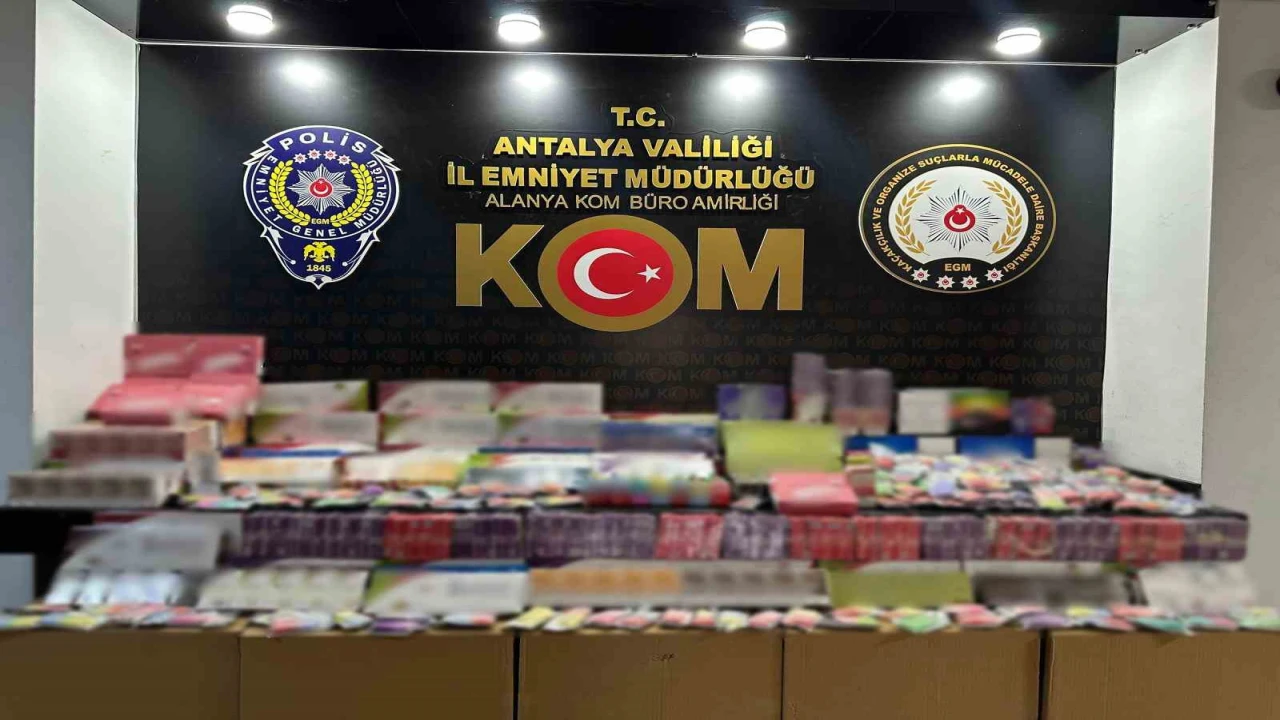 Kepez, Muratpaşa, Alanya, Manavgat ve Kumluca ilçelerinde düzenlenen operasyonlarda iş yeri, depo ve ikametlerde yapılan aramalarda; 733 bin 80 adet kaçak boş ve dolu makaron, bin 480 paket kaçak sigara, 295 adet elektronik sigara, 166 kilogram kıyılmış tütün, 100 litre kaçak içki ve 49 adet kaçak emtia ele geçirildi.