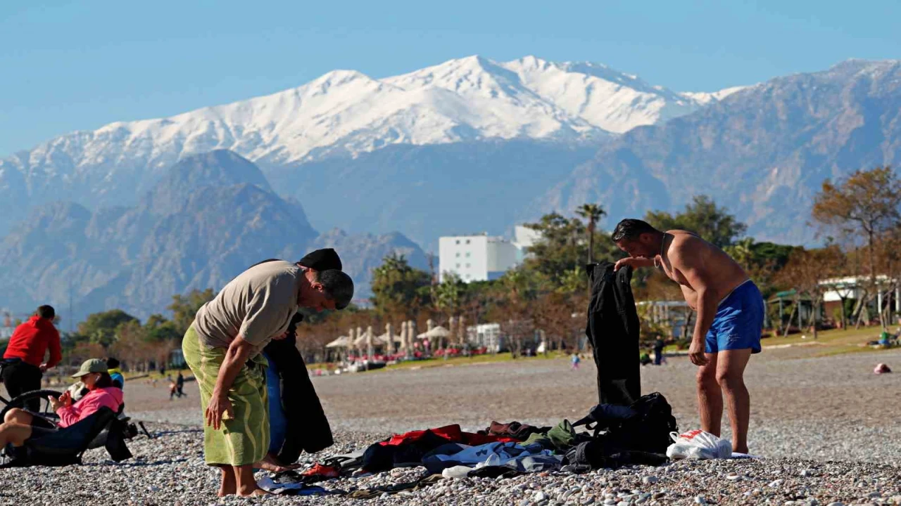 Antalya’da yeni yılın ilk gününde güneşli havayı fırsat bilen kent sakinleri ve yabancı turistler kendini Konyaaltı Sahili’ne attı. Termometrelerin 22 dereceyi gösterdiği Antalya’da sahile gelenler kar manzarası eşliğinde denize girmenin keyfini çıkardı.