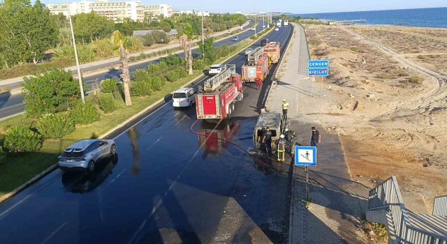 Edinilen bilgiye göre; Manavgat-Alanya D-400 Karayolunda Manavgat istikametinden Alanya istikametine seyir halindeki Tarkan Akkoyun’un kullandığı 07 AYV 363 plakalı panelvan tur aracı, Çenger Mahallesinde motor bölümünden başlayan yangın sonucunda yanmaya başladı.