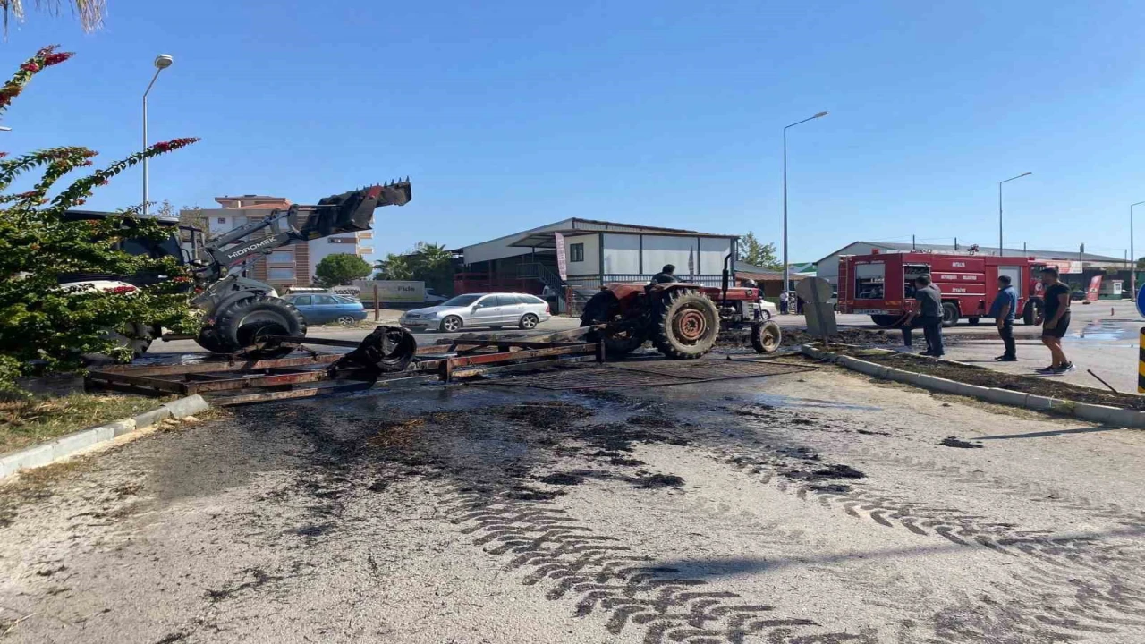 Antalya’nın Serik ilçesinde seyir halindeki traktörde bulunan saman balyaları yanarak küle döndü. Sürücü traktörü yanmaktan son anda kurtardı.