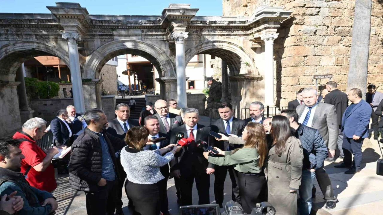 Antalya’da Turizm Haftası kapsamında Hadrian Kapısı önünde düzenlenen etkinlikte konuşan Antalya Valisi Hulusi Şahin, Büyükşehir Belediye Başkanı Muhittin Böcek ve turizm sektörü temsilcileri, yeni sezona dair hedefleri ve kentte yürütülen hazırlıkları kamuoyuyla paylaştı. Şahin, yangın güvenliği denetimlerinden ulaşım projelerine, Kaleiçi’nin UNESCO adaylığı çalışamalarına kadar birçok başlıkta değerlendirmelerde bulundu.