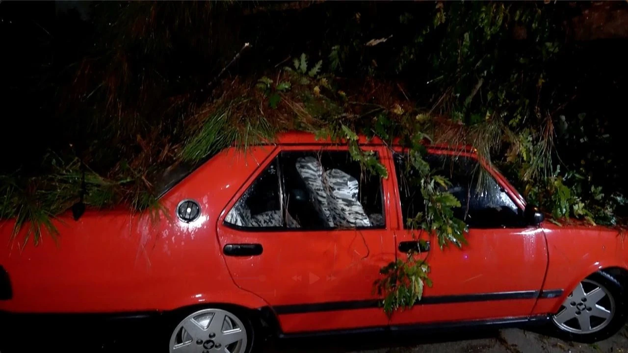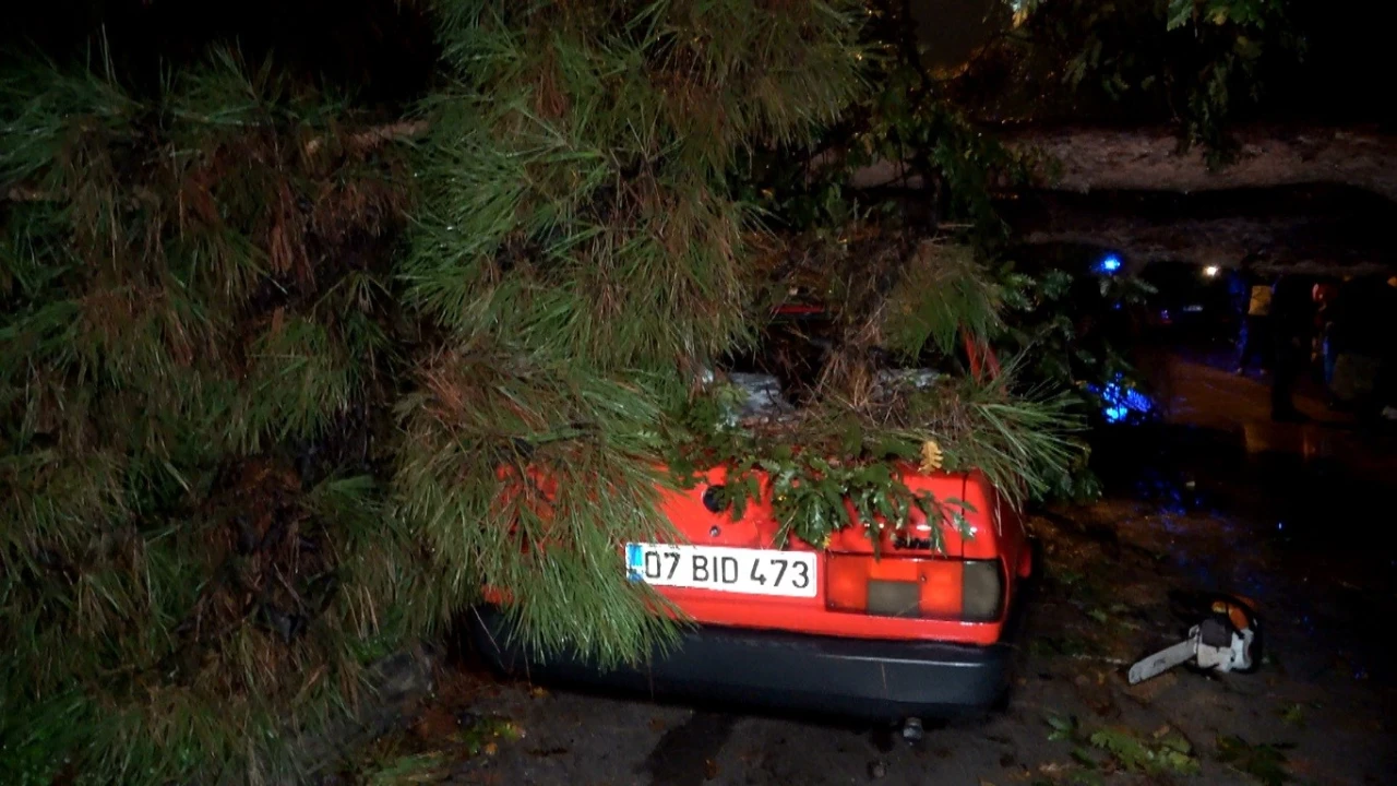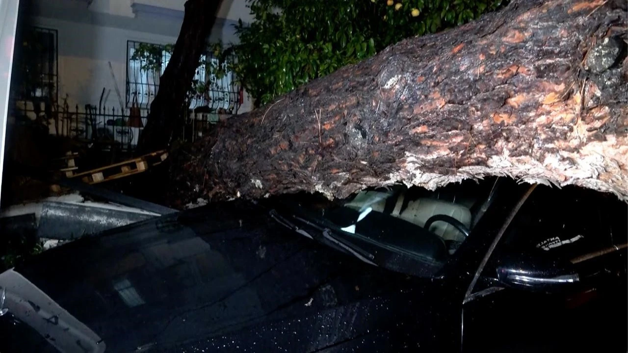 Sarı alarm verilen Antalya’da etkili olan yağış ve şiddetli rüzgar daha önce şikayet edildiği iddia edilen ağacın devrilmesine yol açtı. Olayda iki araç ve bir binada hasar oluşurken şans eseri kimse yaralanmadı.