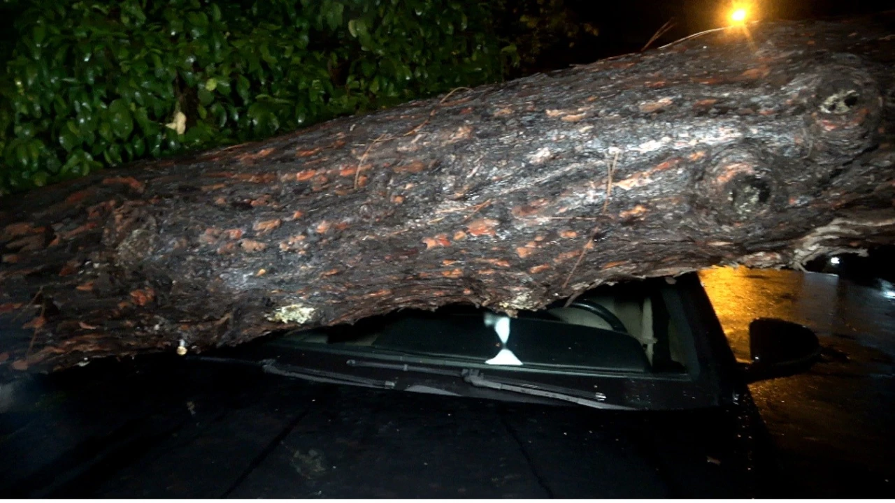 ANTALYA’DA ETKİLİ OLAN YAĞIŞ, DAHA ÖNCE ŞİKÂYET EDİLDİĞİ BELİRTİLEN AĞACIN DEVRİLMESİNE YOL AÇTI; İKİ ARAÇ VE BİR BİNADA HASAR OLUŞTU.