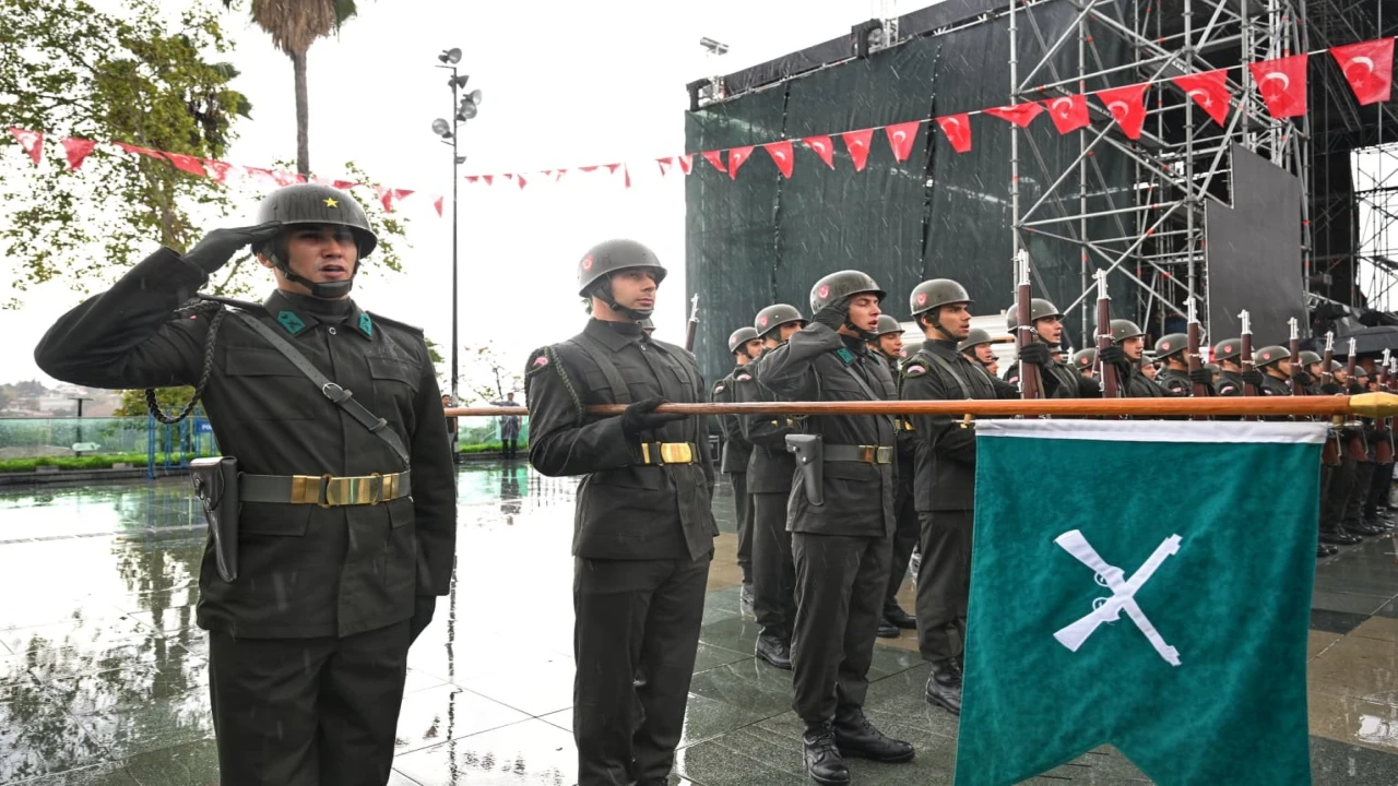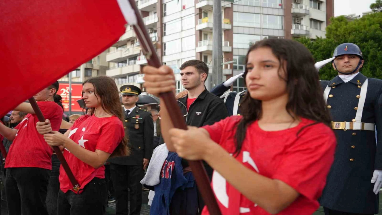 Antalya’da doluya dönen sağanak yağışa rağmen protokol, öğrenciler ve vatandaşlar, Cumhuriyet Meydanı’nı terk etmedi. Protokol üyeleri de yağmur boyunca şemsiye kullanmadı, tören sağanak yağmurun altında tamamlandı.