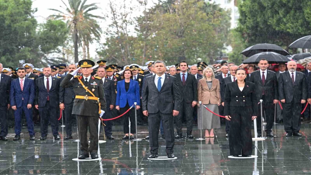 Antalya’da 29 Ekim Cumhuriyet Bayramı kutlamaları, Cumhuriyet’in kurucusu Gazi Mustafa Kemal Atatürk’ün "Efendiler, yarın Cumhuriyeti ilan edeceğiz" dediği 28 Ekim tarihinde düzenlenen çelenk sunma töreniyle başladı. Cumhuriyet Meydanı’ndaki tören, yağmurun zaman zaman doluya dönmesine rağmen coşkulu bir atmosferde gerçekleşti. Törende Türk bayrakları taşıyan öğrenciler, üzerlerine yağan şiddetli yağmura rağmen yerlerinden kıpırdamadan tören bitimine kadar görevlerini sürdürdü. Meydanı dolduran çok sayıda vatandaş da ellerinde şemsiyeler ve yağmurluklarla kutlamalara destek verdi. Protokol üyeleri ise şemsiyesiz şekilde ıslanarak çelenk sunma törenine katıldı. Antalya Valisi Hulusi Şahin, Antalya Büyükşehir Belediyesi Başkan Vekili Büşra Özdemir ve Garnizon Komutanı Tümgeneral Sinan Eren’in çelenklerini bırakmasının ardından tören, saygı duruşu ve İstiklal Marşı’nın okunmasının ardından son buldu.
