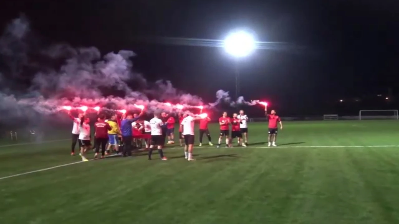 Sporcular önce plan yapıp ardından 112 acil servis ihbar hattını arayıp ‘futbol sahasında büyük bir kavga var’ diye ihbar ettiler. Kavga ediyormuş gibi görüntü verip, olay yerine gelen polisleri gördüklerinde ise Türk Bayrağını açıp meşalelerle Polis gününü kutladılar.