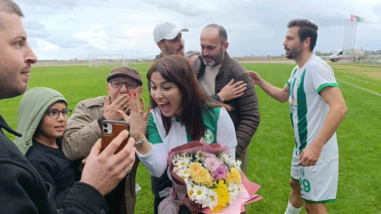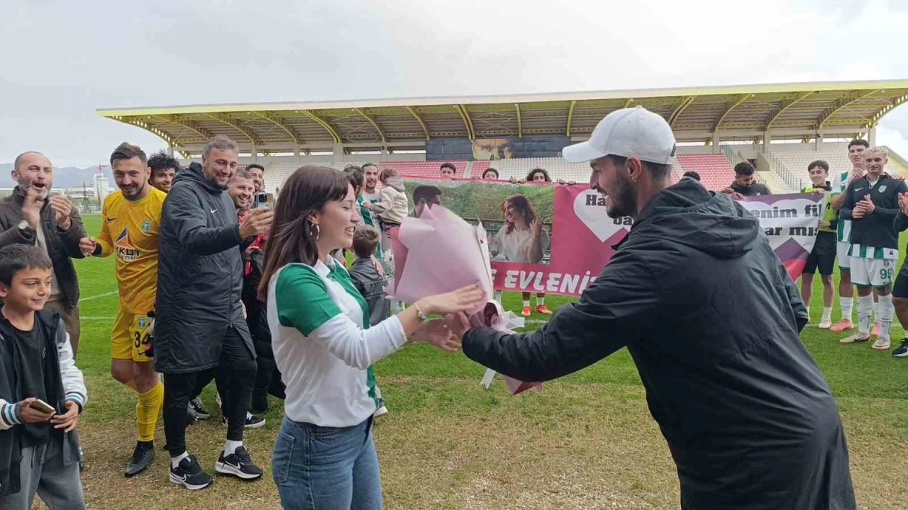 Manavgat Belediyespor ile Mezitli 33 Spor arasında oynanan ve Manavgat ekibinin 4-0’lık galibiyeti ile sona eren karşılaşmanın bitiş düdüğü ile futbolcu ve taraftarlar galibiyet sevincini yaşarken, takımın antrenörlerinden Batuhan Vuruşkan kız arkadaşına yaptığı evlilik teklifine ‘Evet’ cevabını alınca iki mutluluğu birden yaşadı