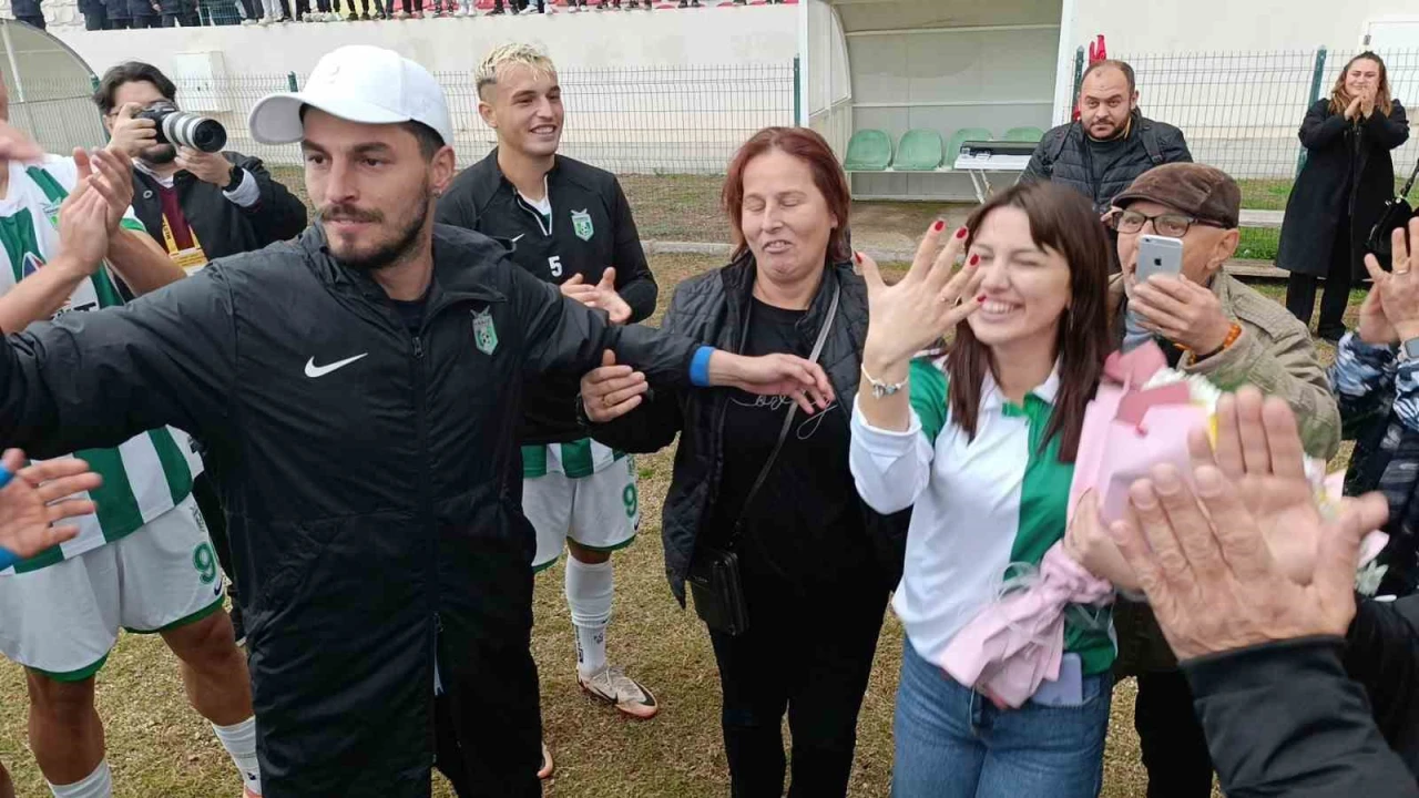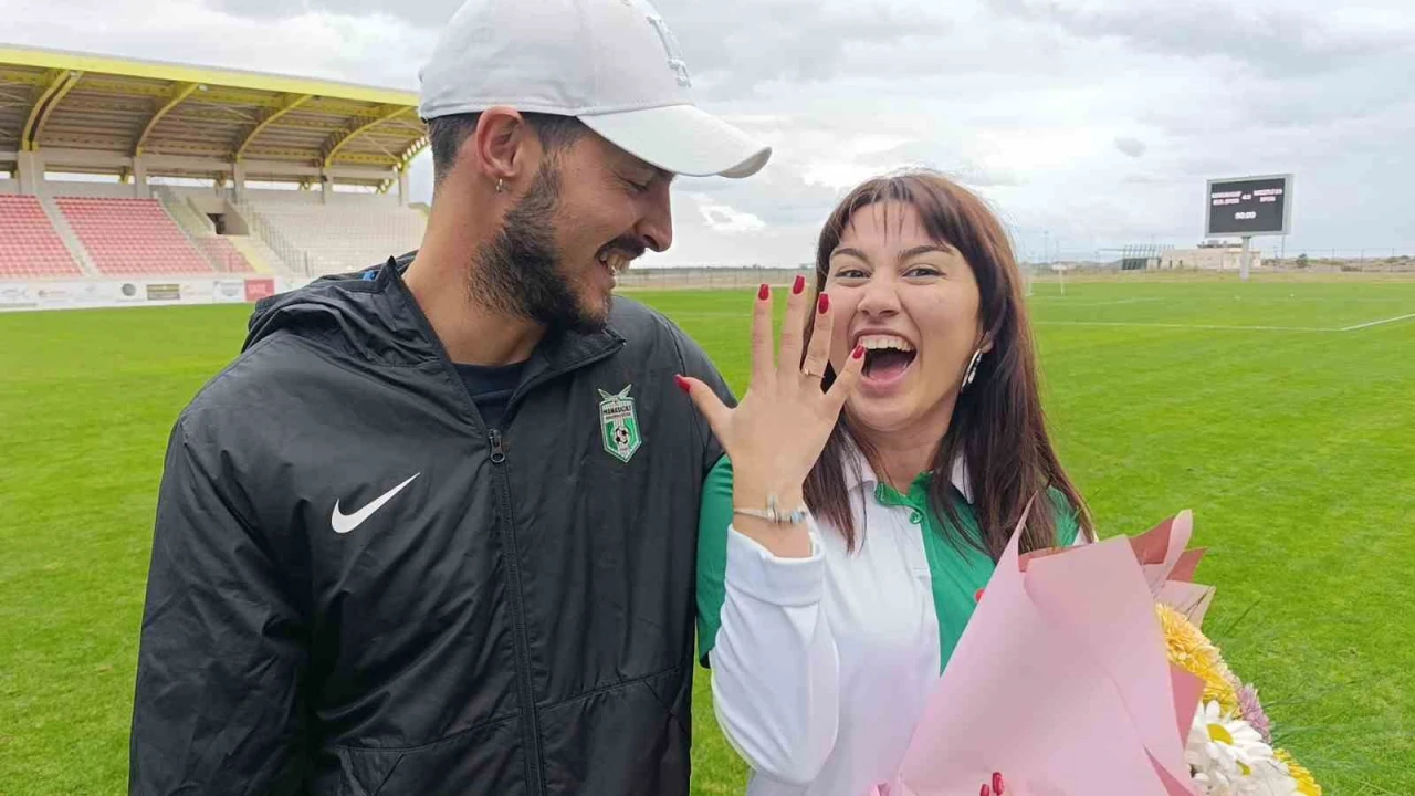 MANAVGAT BELEDİYESPOR İLE MEZİTLİ 33 SPOR ARASINDA OYNANAN VE MANAVGAT EKİBİNİN 4-0’LIK GALİBİYETİ İLE SONA EREN KARŞILAŞMANIN BİTİŞ DÜDÜĞÜ İLE FUTBOLCU VE TARAFTARLAR GALİBİYET SEVİNCİNİ YAŞARKEN, TAKIMIN ANTRENÖRLERİNDEN BATUHAN VURUŞKAN KIZ ARKADAŞINA YAPTIĞI EVLİLİK TEKLİFİNE ‘EVET’ CEVABINI ALINCA İKİ MUTLULUĞU BİRDEN YAŞADI