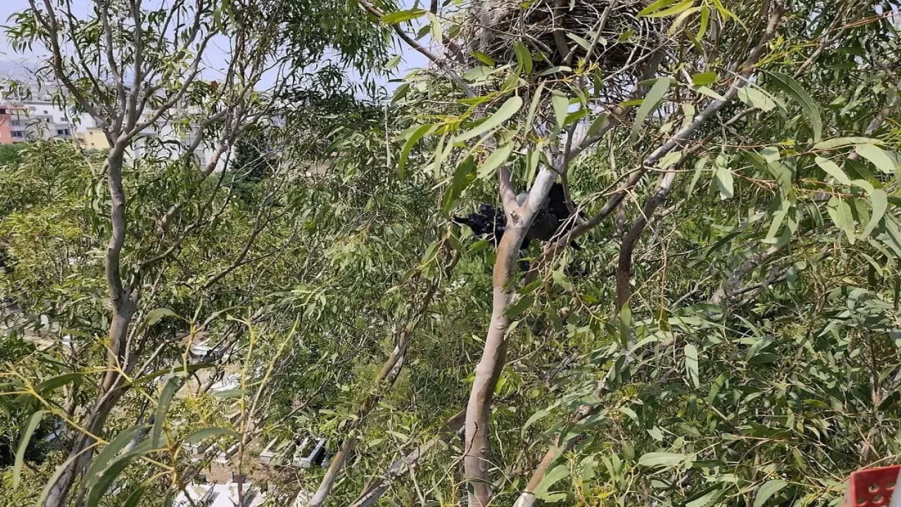 HATAY’IN ARSUZ İLÇESİ AĞAÇTAKİ İPE DOLANAN KARGANIN YARDIMINI İTFAİYE EKİPLERİ YETİŞTİ.