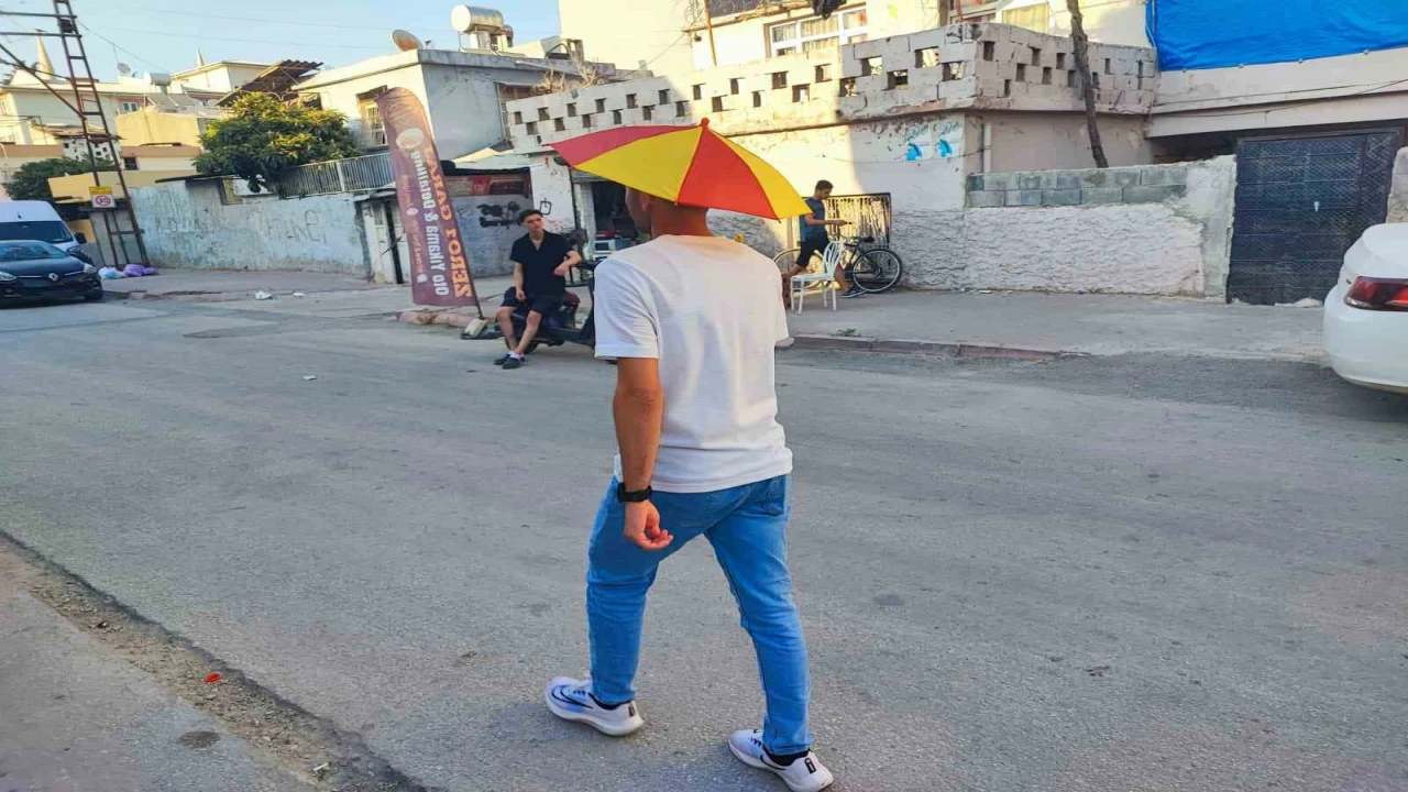 ADANA'DA HİSSEDİLEN SICAKLIK 58 DERECEYİ GEÇİNCE MESUT AKPINAR SOKAĞA KAFASINA TAKTIĞI ŞEMSİYE İLE ÇIKMAYA BAŞLADI