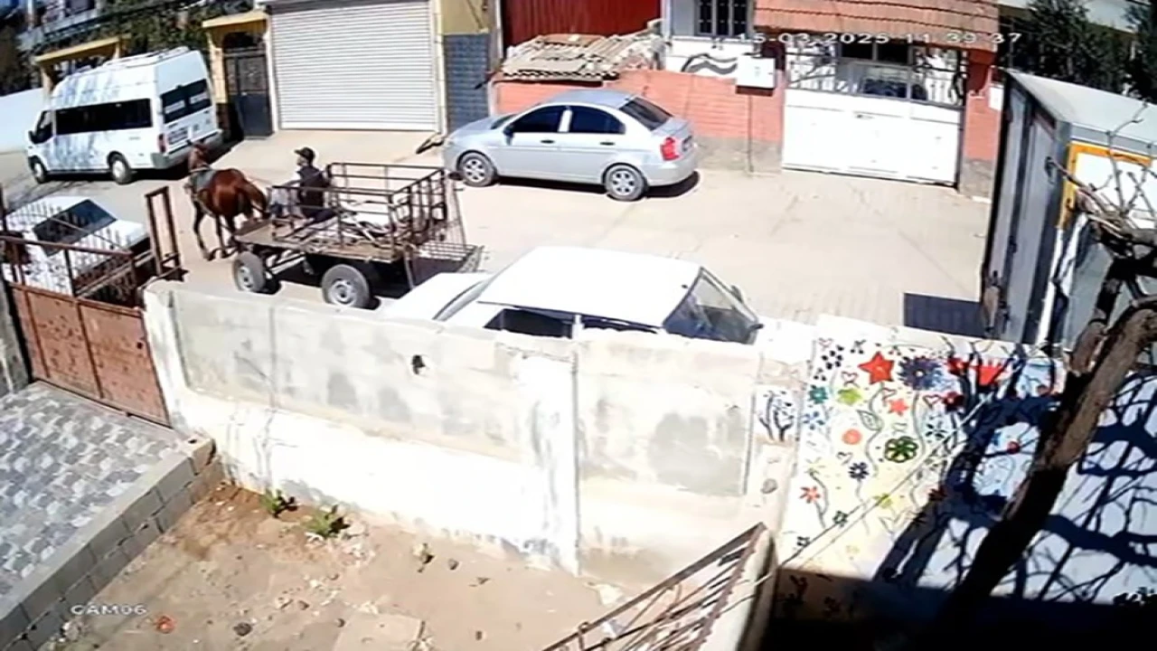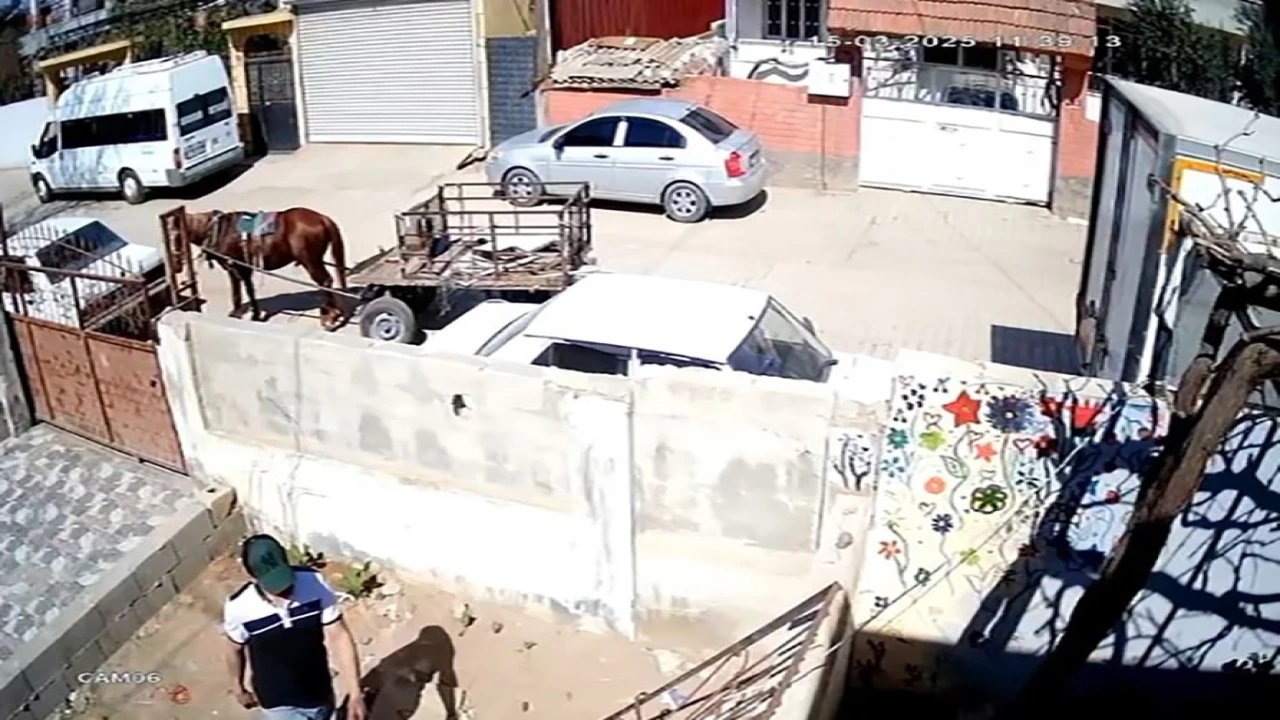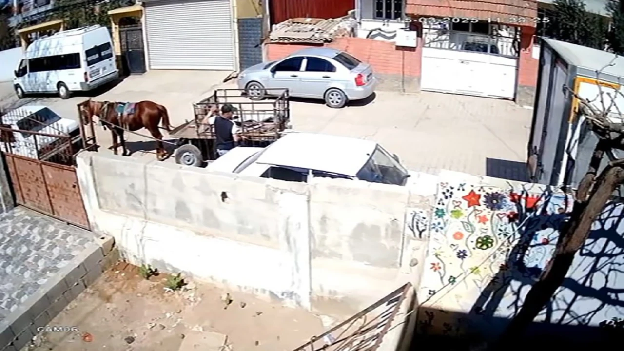 HATAY’IN REYHANLI İLÇESİNDE AT ARABASIYLA GELEN ŞAHIS, EVİN BAHÇESİNDE OLAN DEMİR KORKULUĞU ALARAK UZAKLAŞTIĞI ANLAR GÜVENLİK KAMERASINA YANISIDI.