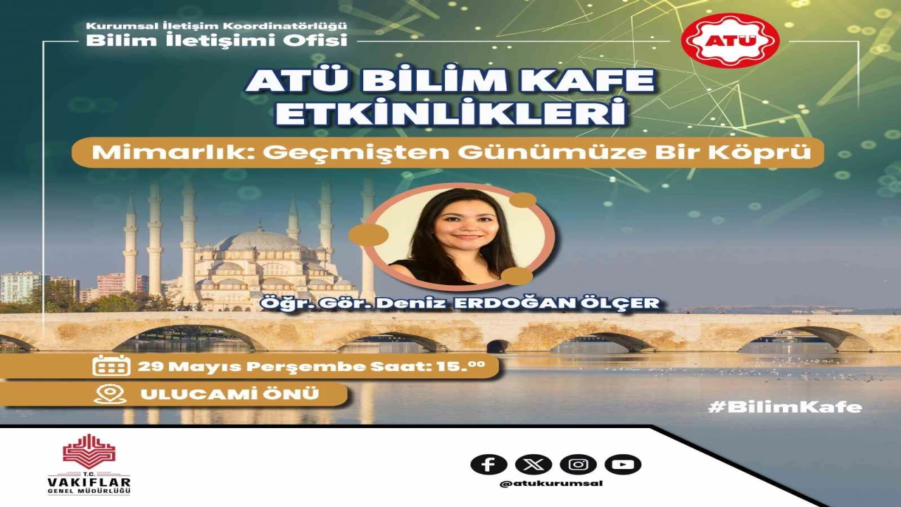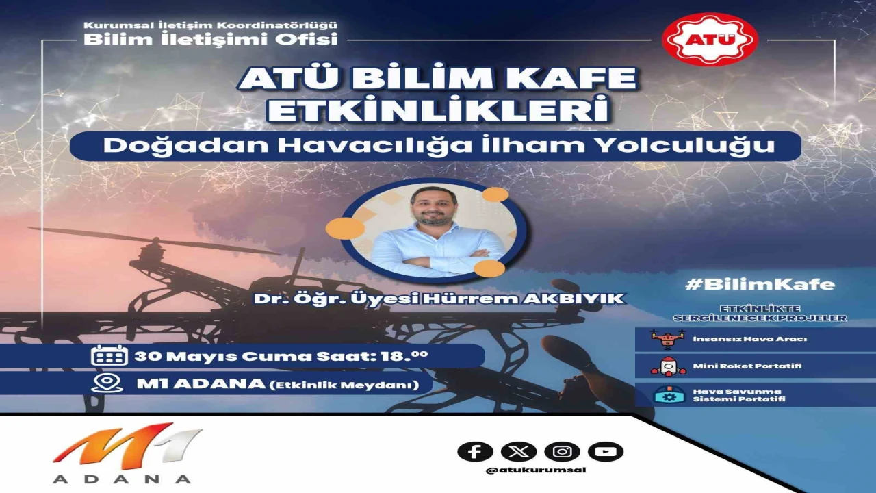 Adana Alparslan Türkeş Bilim ve Teknoloji Üniversitesi (ATÜ) Kurumsal İletişim Koordinatörlüğü Bilim İletişimi Ofisi tarafından 29 Mayıs-1 Haziran 2025 tarihleri arasında "ATÜ Bilim Kafe" etkinlikleri düzenleniyor. Şehrin çeşitli noktalarında gerçekleştirilecek bu etkinliklerle, bilimsel bilgi sade bir dille halka ulaştırılacak.