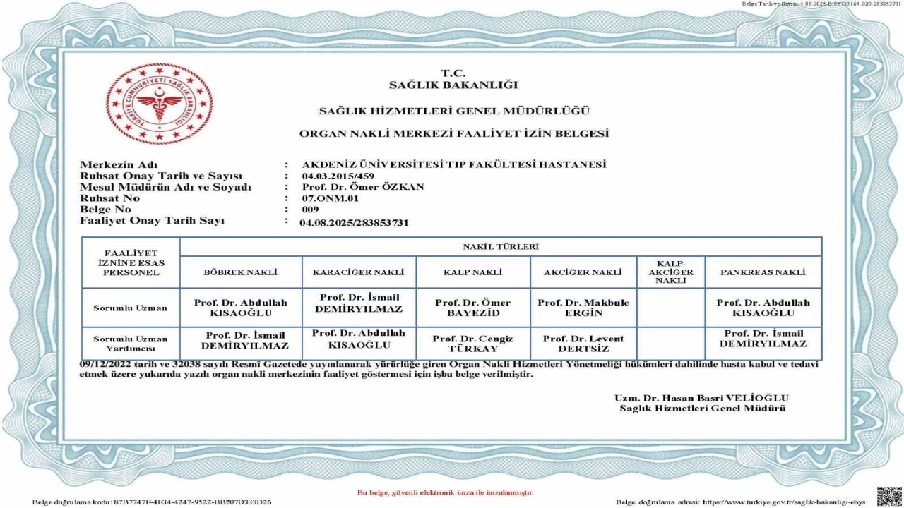İLKLERİYLE DÜNYA TIP TARİHİNE GEÇEN AKDENİZ ÜNİVERSİTESİ ORGAN NAKLİ MERKEZİ, SAĞLIK BAKANLIĞI'NDAN ALDIĞI RUHSATLA TÜRKİYE'NİN AKCİĞER NAKLİ YAPABİLEN 3. MERKEZİ OLDU.