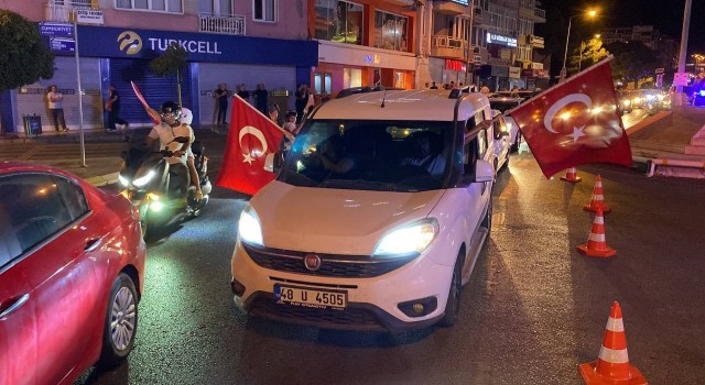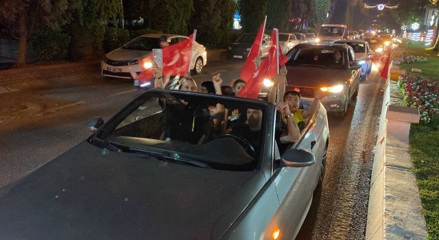 AYDIN (İHA) - A MİLLİ FUTBOL TAKIMI, 2024 AVRUPA FUTBOL ŞAMPİYONASI (EURO 2024) SON 16 TURUNDA RAKİBİ AVUSTURYA'YI 2-1 YENEREK ÇEYREK FİNALE YÜKSELİRKEN, MİLLİ MAÇI KENT MEYDANI'NDA İZLEYEN BİNLERCE AYDINLI İSE ÇEYREK FİNALİ COŞKUYLA KUTLADI. ELLERİNE ALDIKLARI TÜRK BAYRAKLARIYLA GALİBİYETİ KUTLAYAN VATANDAŞLAR, SOKAK VE CADDELERİ ADETA KIRMIZI-BEYAZA BOYADI.