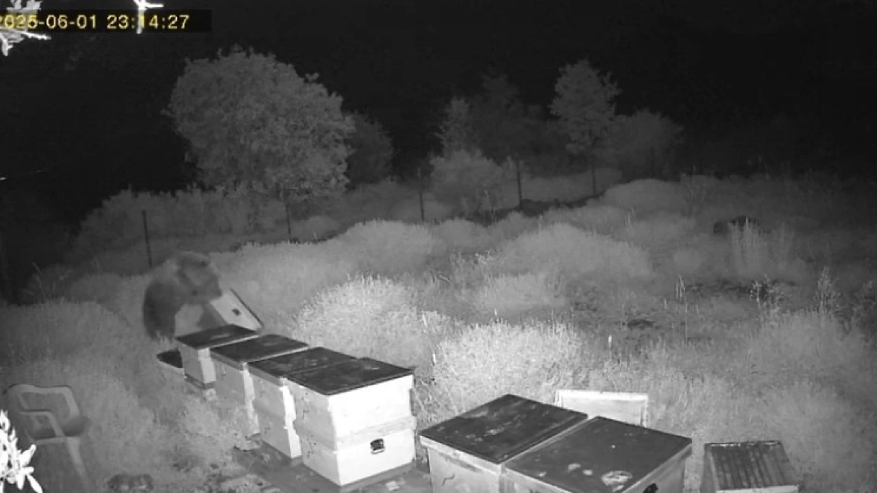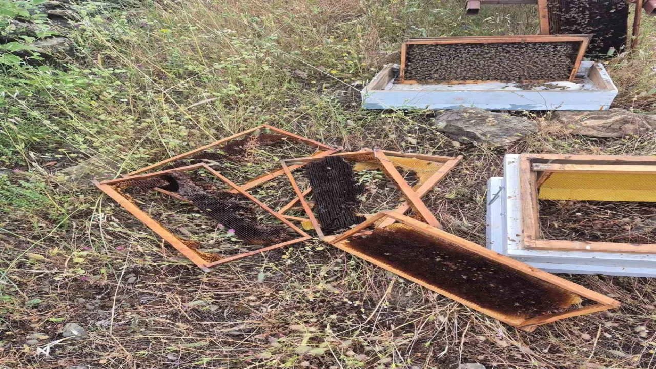GÖRÜNTÜLERDE, AYININ KOVANLARI PARÇALADIĞI VE BALLARI YEDİĞİ ANLAR AÇIKÇA GÖRÜLDÜ. SALDIRI SONUCU ÇOK SAYIDA KOVAN KULLANILAMAZ HALE GELİRKEN, ARI KOLONİLERİ DE ZARAR GÖRDÜ.