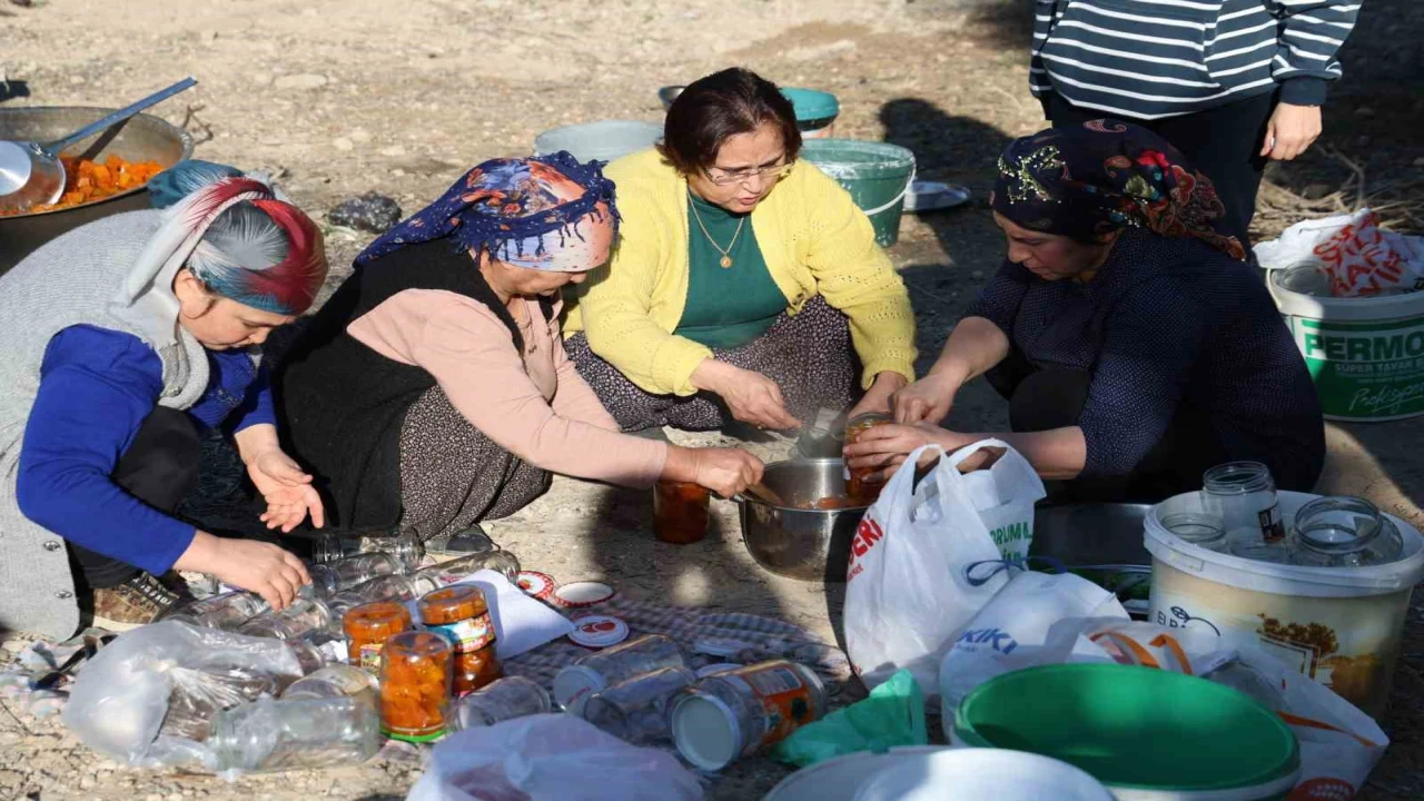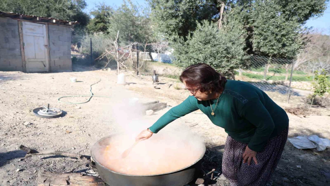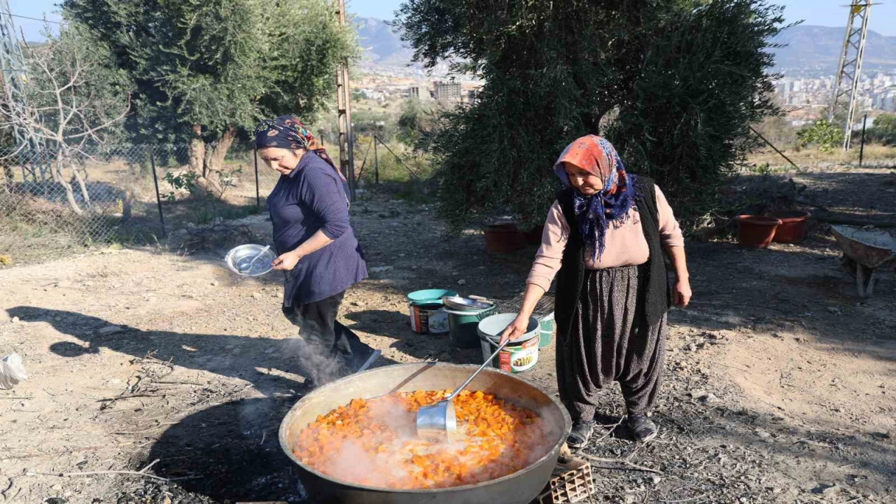 Adana’nın Kozan ilçesinde kadınlar, bahçede imece usulü kazanlarda kabak tatlısı yaptı.