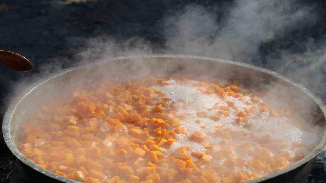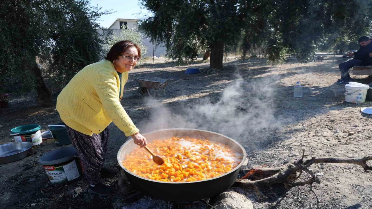 Kabak tatlısı yapan Ayşe Ayhan, "Lezzeti vazgeçilmez olsa da mesaisi zor bir tatlı. Biz yaklaşık 30 kilo kabağı bir gün önce imece usulü kestik dilimledik. Bir gün sönmüş kireçte beklettik. Kireçte bekletmemizin nedeni çıtır kıvama ulaşması. Saatlerce odun ateşinde kaynıyor. Kış boyu yemeklerde, çayın yanında bölgemizde sık kullanılan bir lezzet" diye konuştu.