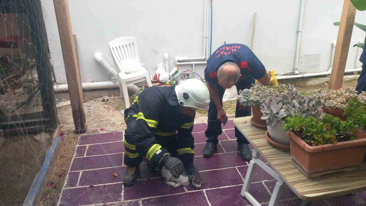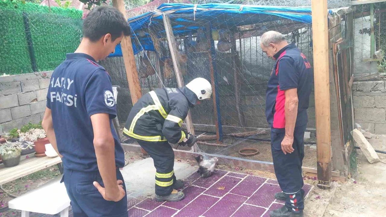 Hatay’ın Samandağ ilçesinde balık ağına takılan kedi, itfaiye ekipleri tarafından kurtarıldı.
