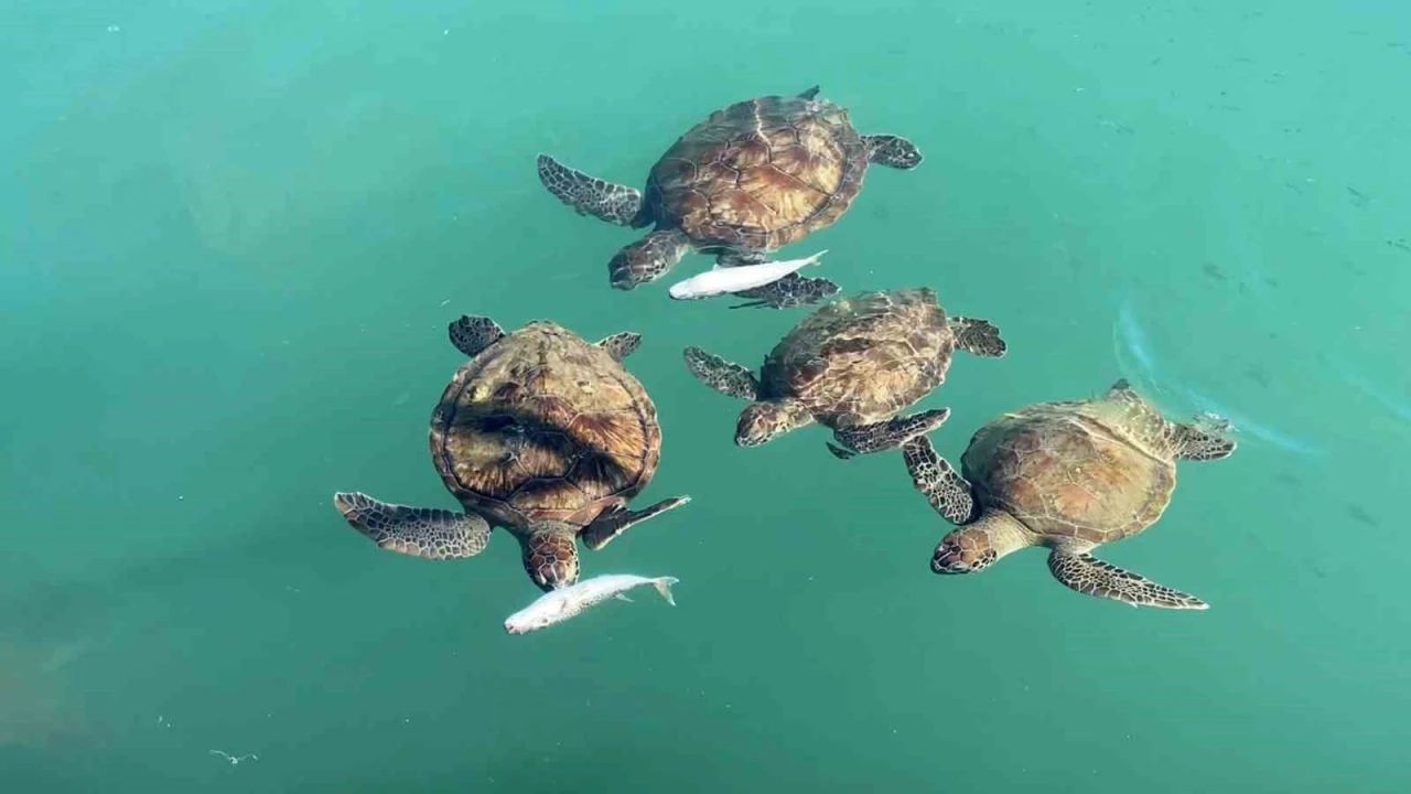Mersin’de göç etmeyen caretta carettalar balıkçı barınağını mesken tuttu. Balıkçıların yolunu gözleyen çevresinde gezerek beslenen büyüklü küçüklü kaplumbağalar renkli görüntüler oluşturuyor.