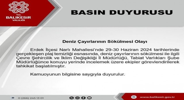 Balıkesir Valiliği tarafından yapılan açıklamada, şu ifadelere yer verildi; “Erdek ilçesi Narlı Mahallesi’nde 29-30 Haziran 2024 tarihlerinde gerçekleşen plaj temizliği esnasında, deniz çayırlarının sökülmesi ile ilgili Çevre Şehircilik ve İklim Değişikliği İl Müdürlüğü, Tabiat Varlıkları Şube Müdürlüğünce konuyu yerinde incelemek üzere ekipler görevlendirilerek tahkikat başlatılmıştır. Kamuoyunun bilgisine saygıyla duyurulur.”