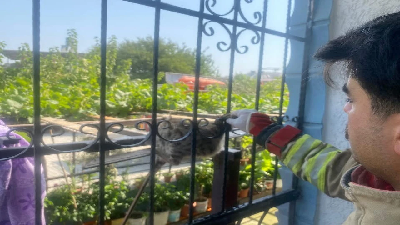 Hatay’ın Antakya ilçesinde balkonun demir korkuluklarına sıkışan kedi, itfaiye ekiplerinin müdahalesiyle kurtarıldı.