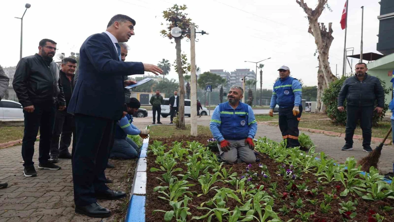 Akdeniz Belediye Başkan Vekili Zeyit Şener, incelemeleri sırasında işçilerle birlikte mevsimlik çiçek ve ağaç dikimi de yaptı.