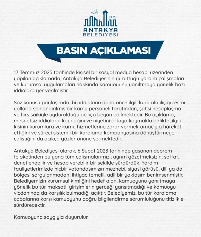 Açıklamada ayrıca, 6 Şubat 2023 depreminin ardından Antakya Belediyesi tarafından yürütülen yardım faaliyetlerinin tümüyle şeffaf, denetlenebilir ve toplumsal hassasiyetlere uygun şekilde gerçekleştirildiği vurgulandı. Belediyenin hiçbir vatandaşın mezhebi, siyasi görüşü, dili ya da bölgesi üzerinden ayrım gözetmeden; tamamen ihtiyaç temelli ve adil bir anlayışla hareket ettiği ifade edildi.