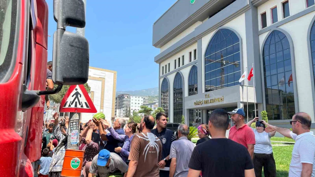 Osmaniye’nin Düziçi ilçesinde karpuz üreticisi çiftçiler tarlada kilosu 1-2 liraya düşen karpuzdan dolayı hayal kırıklığına uğradı. Düziçi ilçesinin Çiftlik Mahallesi’nde 100 dönüm alana karpuz ekimi yapan çiftçi Ersin Ala ürünün bereketli bol olmasından dolayı ürünü tarlada 3 TL’ye satışa çıkardı. Bunun üzerine harekete geçen Düziçi Belediye Başkanı Mustafa İba, hem çiftçinin mağdur olmaması için hem de vatandaşa sıcak yaz günlerinde serinleten bir ikram yapmak için tarlada bulunan 200 ton karpuzu alıp belediye binası önünde vatandaşa ücretsiz dağıttı.