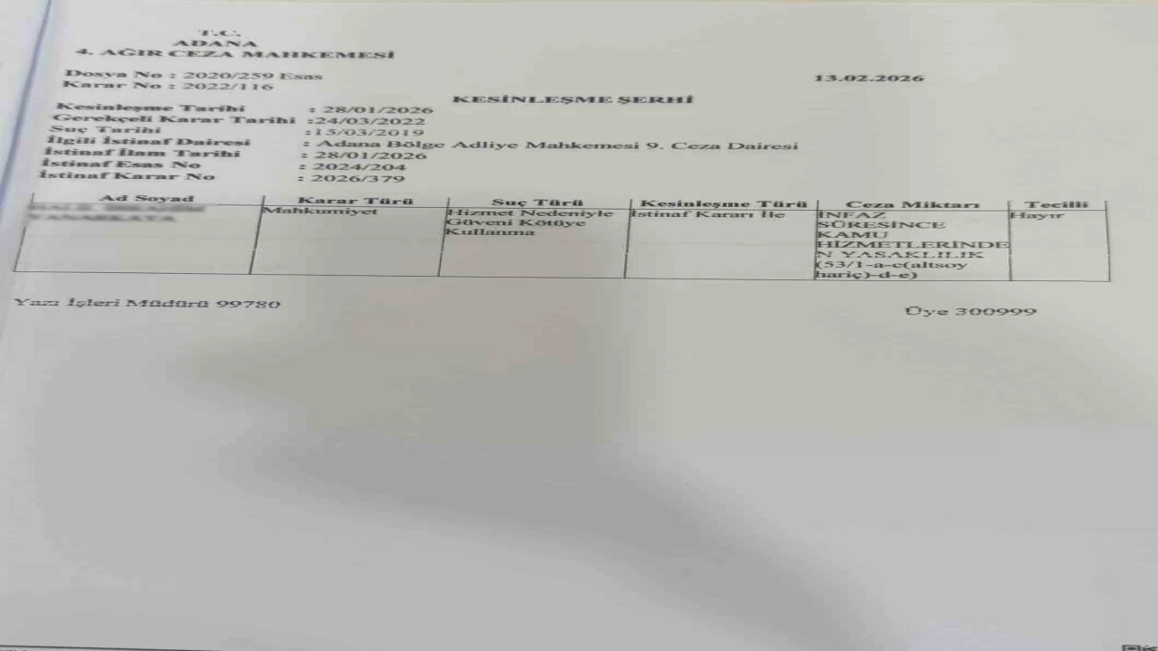 Mahkeme, ’hizmet nedeniyle güveni kötüye kullanma’ suçundan 2022 yılında 1 yıl 8 ay hapis ve 5 bin lira adli para cezası verdi. H.İ.Y., karara itiraz etti ancak Adana Bölge Adliye Mahkemesi 9.Ceza Dairesi, kararı onadı.