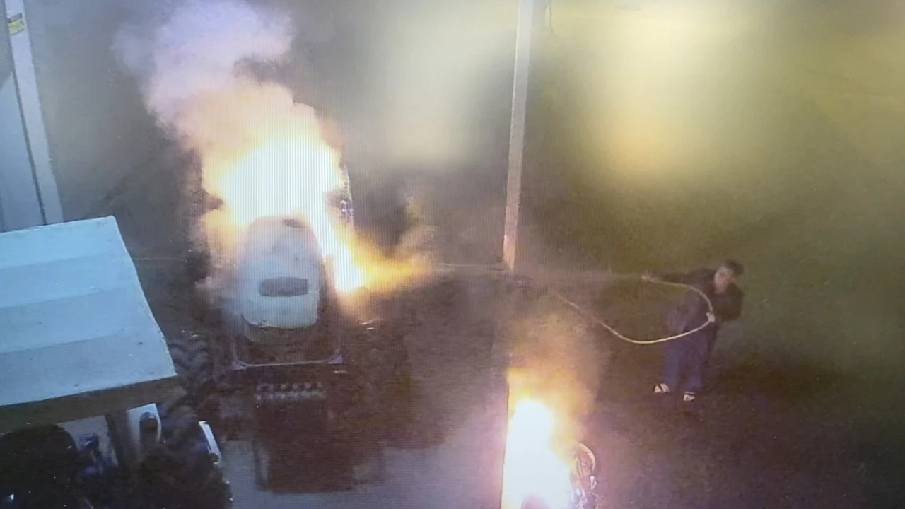 Olay anıysa güvenlik kameralarına anbean yansıdı. Motosikletiyle gelen şüpheli, elindeki şişeyle benzini traktöre doğru döktü. Bu sırada etrafa benzinin saçıldığı gözlenirken, şüphelinin ateşi yakmasıyla birlikte şüphelinin, kullandığı motosikletin ve traktörün alev aldığı görüldü.