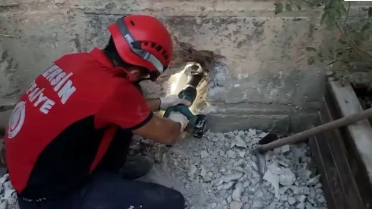 İhbar üzerine bölgeye giden Mersin Büyükşehir İtfaiyesi Arama-Kurtarma ekipleri, kedinin yerini tespit etti. Yavruya zarar vermemek için titizlikle çalışan ekipler, beton delici ile yaklaşık 40 santimetre çapındaki perde betonu kırarak ilerledi. Yaklaşık 3,5 saat süren zorlu operasyon sonunda itfaiye eri, eliyle ulaştığı yavru kediyi bulunduğu yerden çıkardı. Operasyon süresince anne kedi de ekiplerin başından ayrılmadı. Kurtarılan yavru kedi annesine kavuşunca korkusunu geride bıraktı.