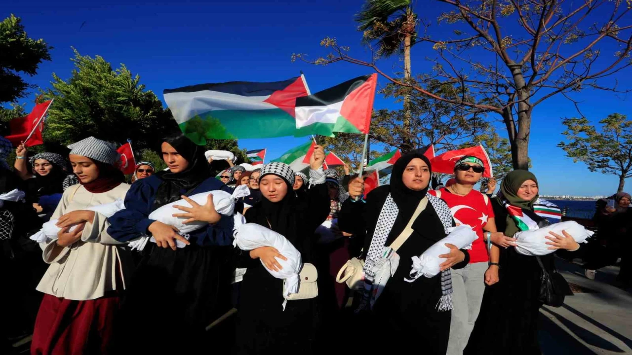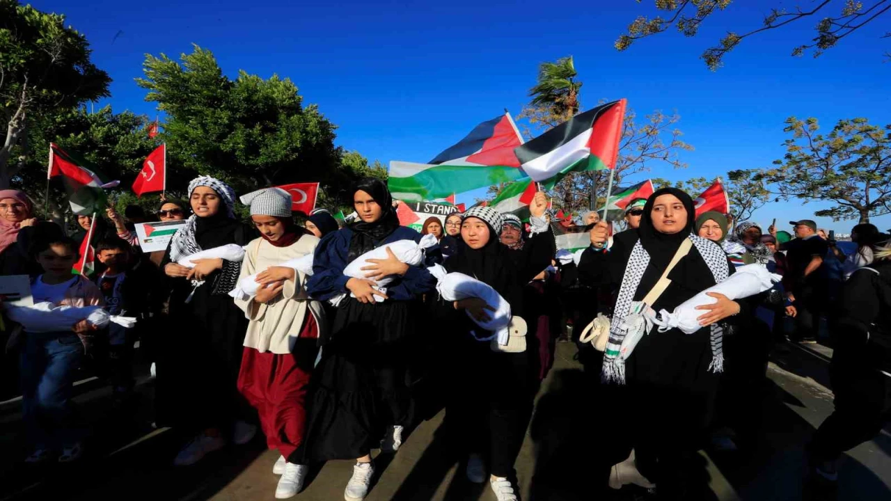 Antalya Kudüs Platformu’nun çağrısı ile Gazze’de yaşanan katliama dikkat çekmek amacıyla yürüyüş düzenlendi. Ellerinde Türkiye ve Filistin bayrakları bulunan binlerce kişi, Konyaaltı Olbia meydanında toplandı. Yürüyüşe karadan motosiklet gruplarının yanı sıra denizden de tekneler eşlik etti. Ellerinde Gazze’de hayatını kaybeden bebek ve çocukları temsil eden kefene sarılmış bebek figürleri bulunan grup üyeleri, ‘Antalya’dan Gazze’ye direnişe bin selam’ ve ‘Çocuklar ölürken sessiz kalınmaz’ sloganları attı. Konyaaltı Kent Meydanı’na kadar olan yaklaşık 2 kilometrelik yürüyüşe katılanlara çevredeki vatandaşlar da destek verdi.