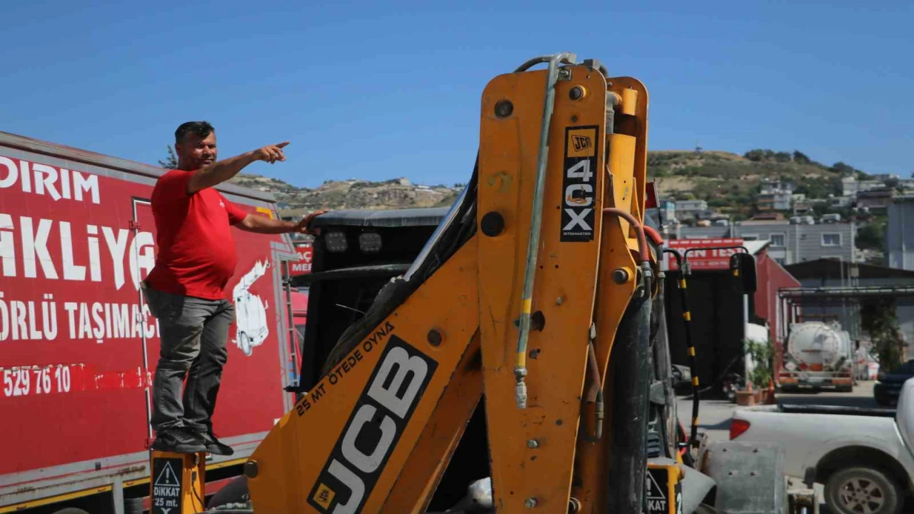 HATAY’DA HAFRİYATÇILIK YAPAN BÜLENT KUYUCU, KEPÇESİNİN BOMUNUN ÜZERİNE YUVA YAPAN KUMRUNUN YUVASINI BOZMAMAK İÇİN 17 GÜNDÜR ARACINI ÇALIŞTIRMIYOR.