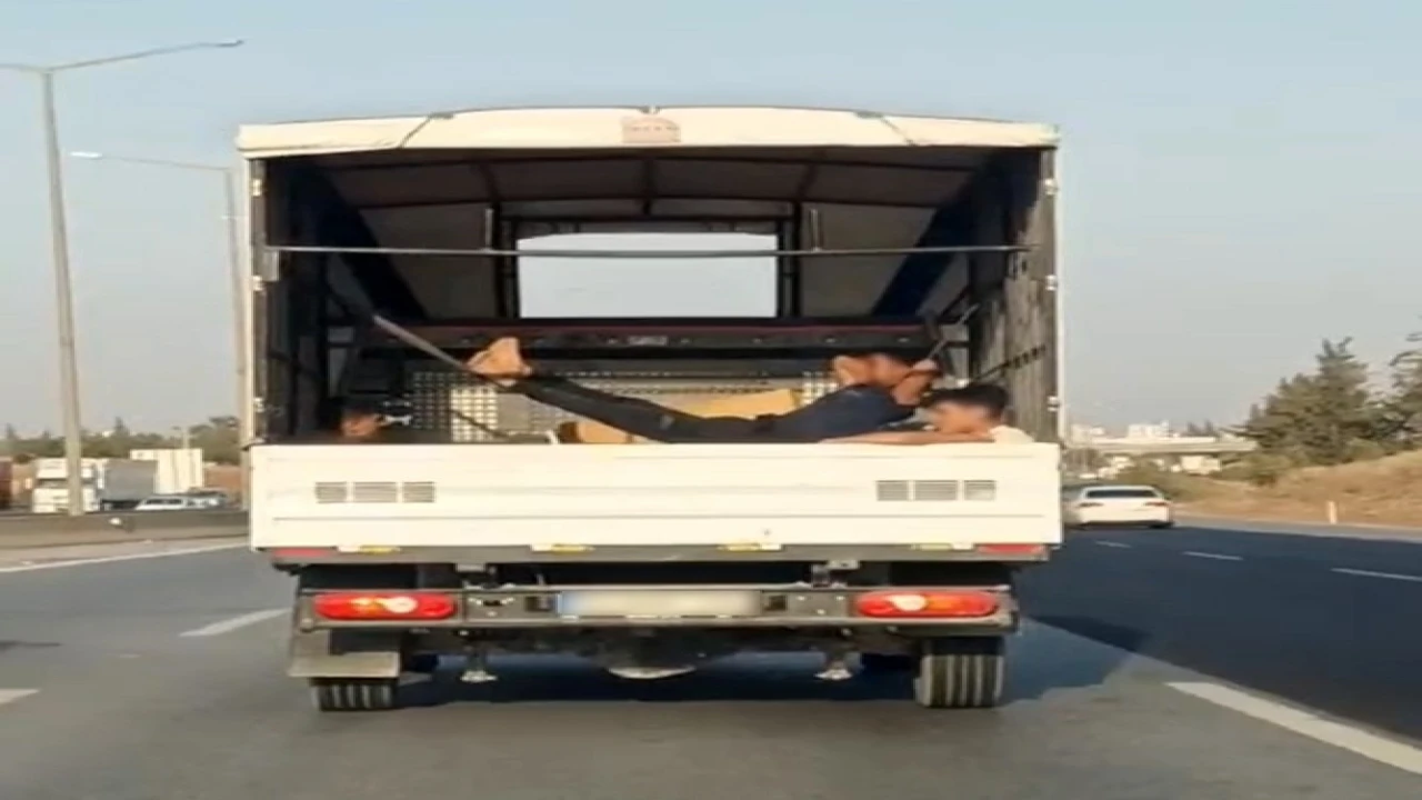 Adana’da iki ayrı kamyonette yolculuk yapan vatandaşlardan biri kendini iple kamyonete bağlarken, diğeri de kamyonet kasasındaki hamakta keyifle yoluculuk yaptı.