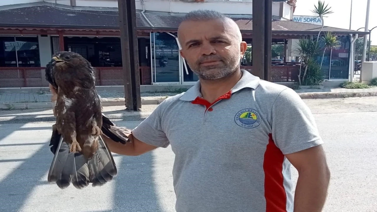 Mersin’in Erdemli ilçesinde belediye personeli, bitkin halde bulduğu şahini doğa koruma ekiplerine teslim etti.