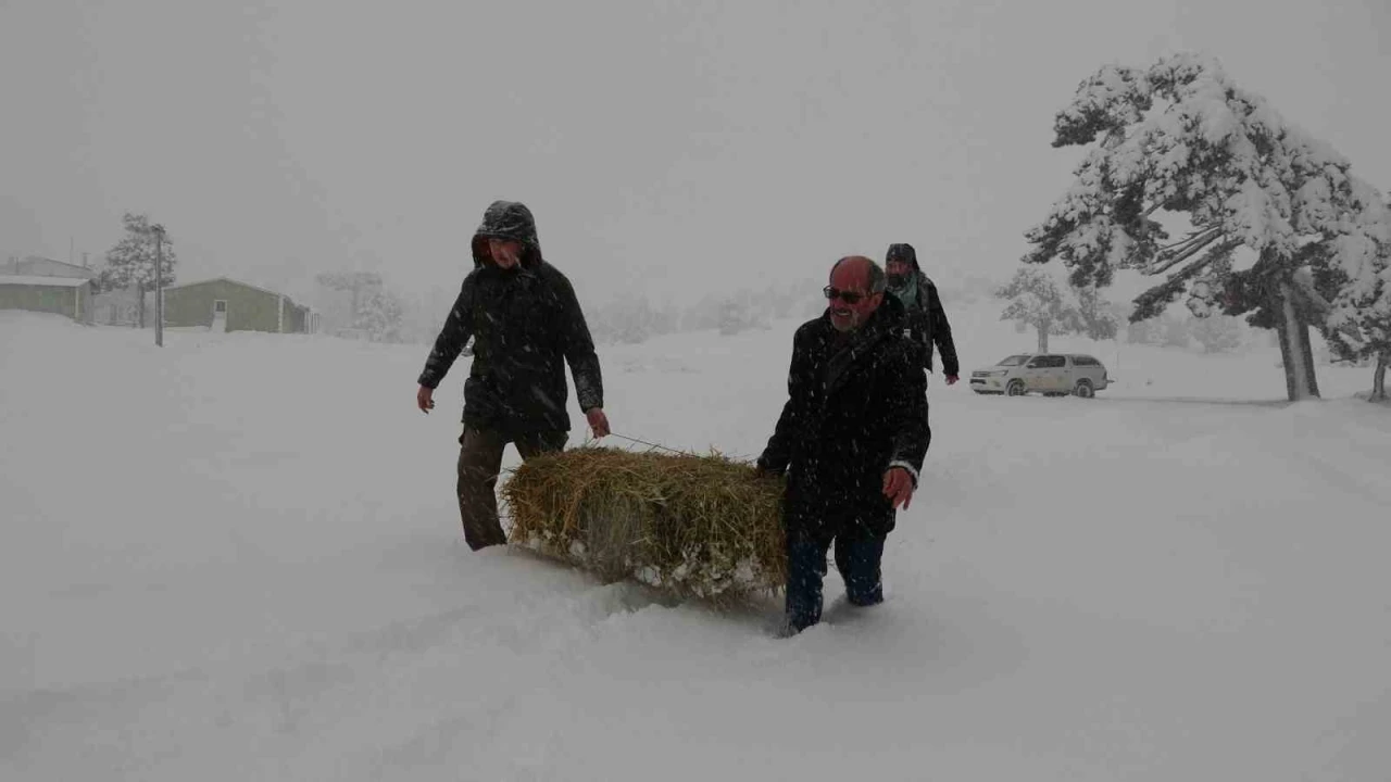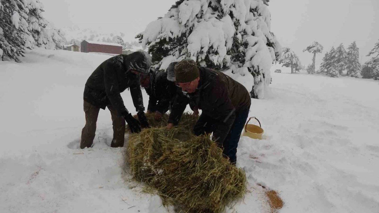 Burdur’da yoğun kar yağışının etkili olduğu ve kar kalınlığının yarım metreyi bulduğu Eşeler Yaylası’nda Doğa Koruma ve Milli Parklar (DKMP) ekipleri, yaban hayvanları ve kızıl geyikler için yem bırakıyor.