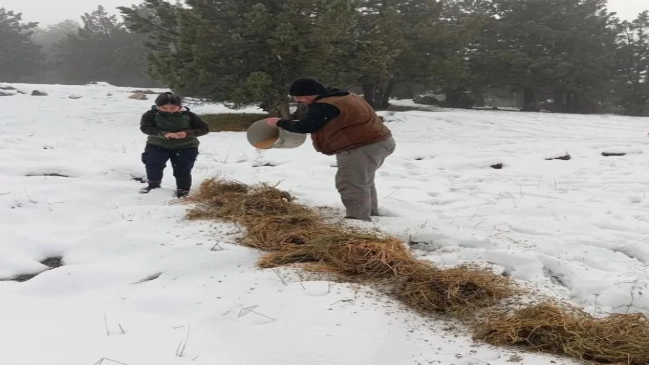 BURDUR’DA YOĞUN KAR YAĞIŞININ ETKİLİ OLDUĞU VE KAR KALINLIĞININ YARIM METREYİ BULDUĞU EŞELER YAYLASI'NDA DOĞA KORUMA VE MİLLİ PARKLAR (DKMP) EKİPLERİ, YABAN HAYVANLARI VE KIZIL GEYİKLER İÇİN YEM BIRAKIYOR.