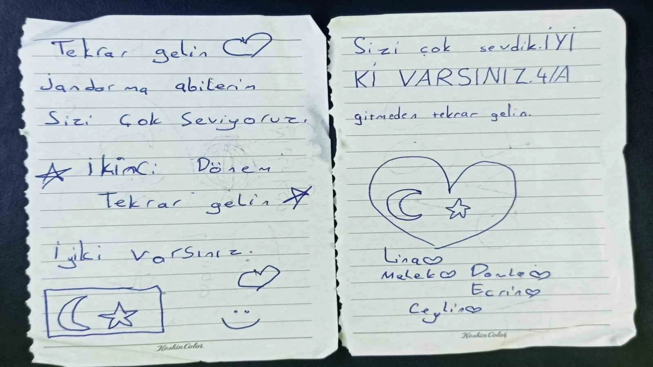 Notlardan birinde “Tekrar gelin Jandarma ağabeylerim, sizi çok seviyoruz. İkinci dönem tekrar gelin. İyi ki varsınız!” ifadeleri yer alırken, bir diğer notta ise “Sizi çok sevdik. İyi ki varsınız 4/A. Gitmeden tekrar gelin!” yazdığı görüldü.