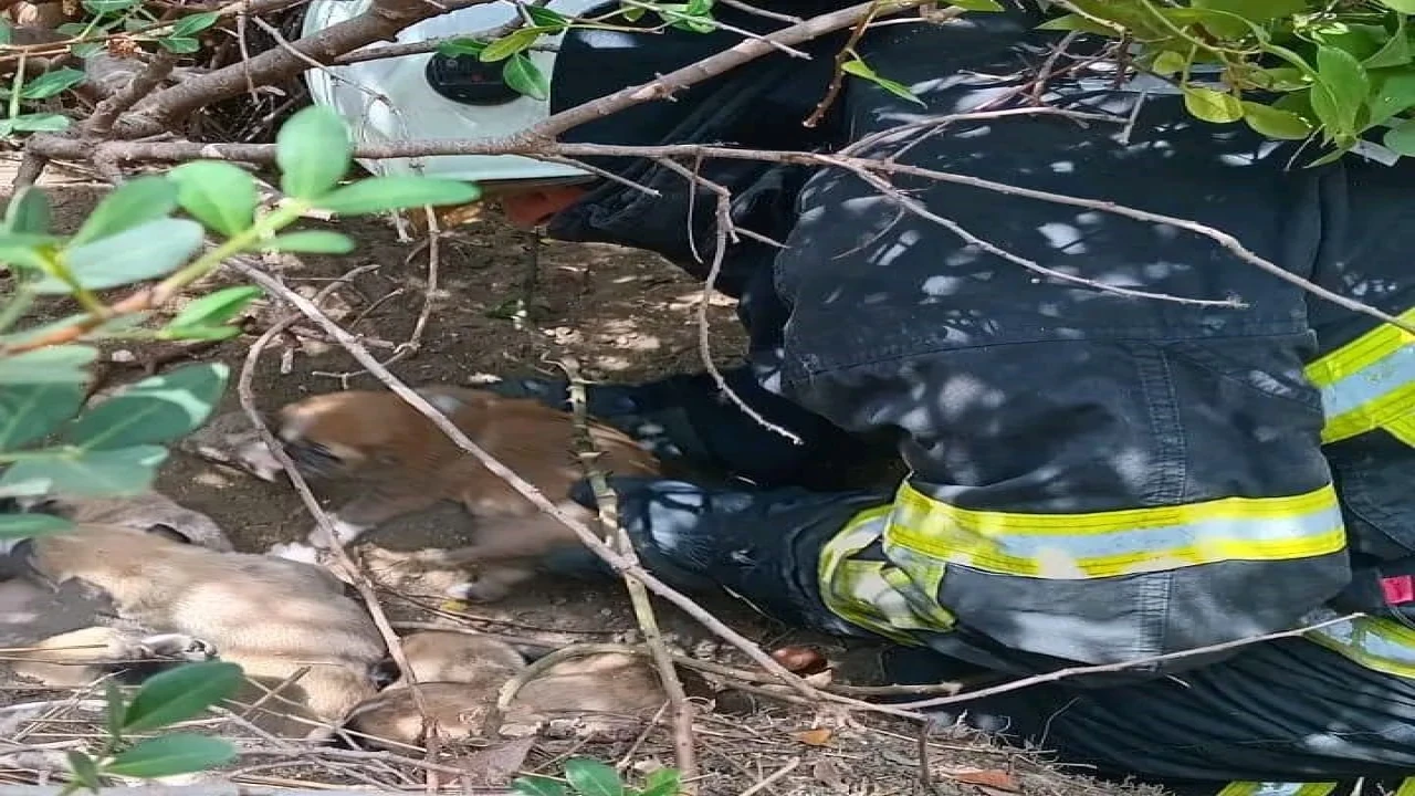 Hatay’ın Samandağ ilçesinde çalıların arasındaki boşluğa düşen yavru köpekleri, itfaiye ekipleri kurtardı.