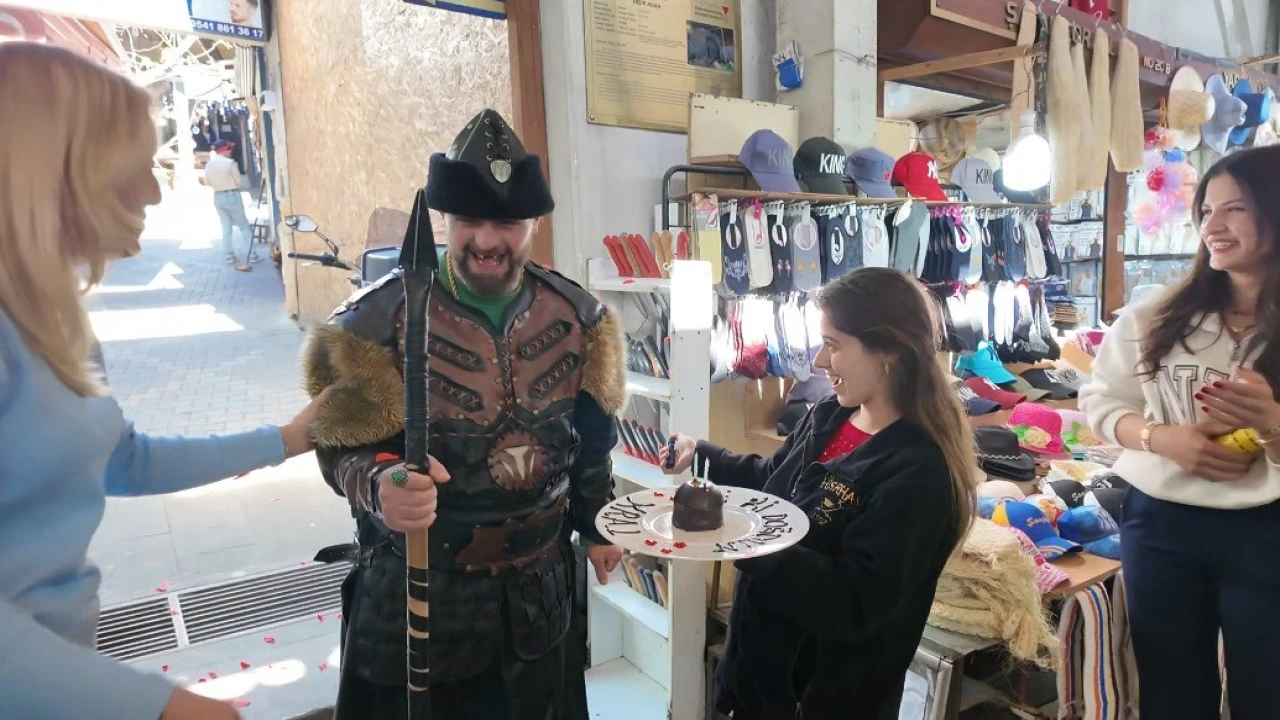 Kapalı çarşıda Osmanlı döneminden kalma tarihi han önünde gelenleri karşılayan down sendromlu Emre Kala 32 yaşına girdi. Çarşının adeta maskotu haline gelen Emre için bölge esnafı sürpriz doğum günü yaptı. Sürekli giydiği Osmanlı kıyafetiyle de dikkat çeken Emre’nin, o anlarda mutluluğu yüzüne yansıdı.