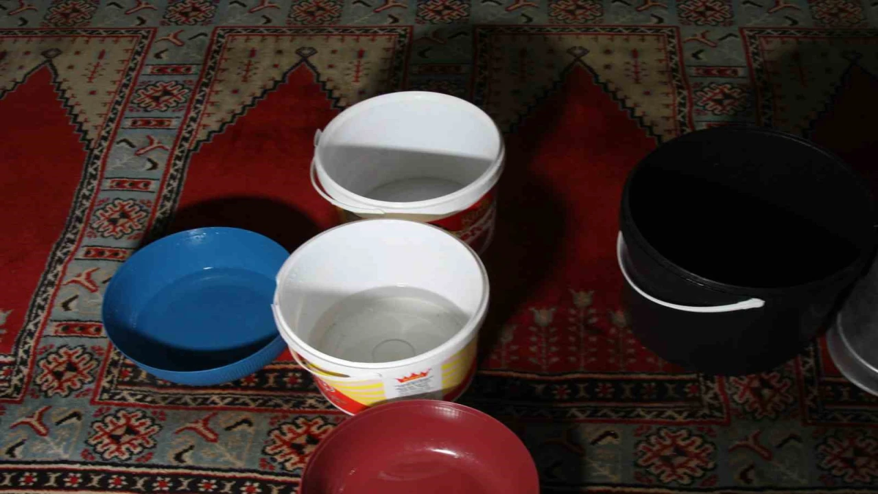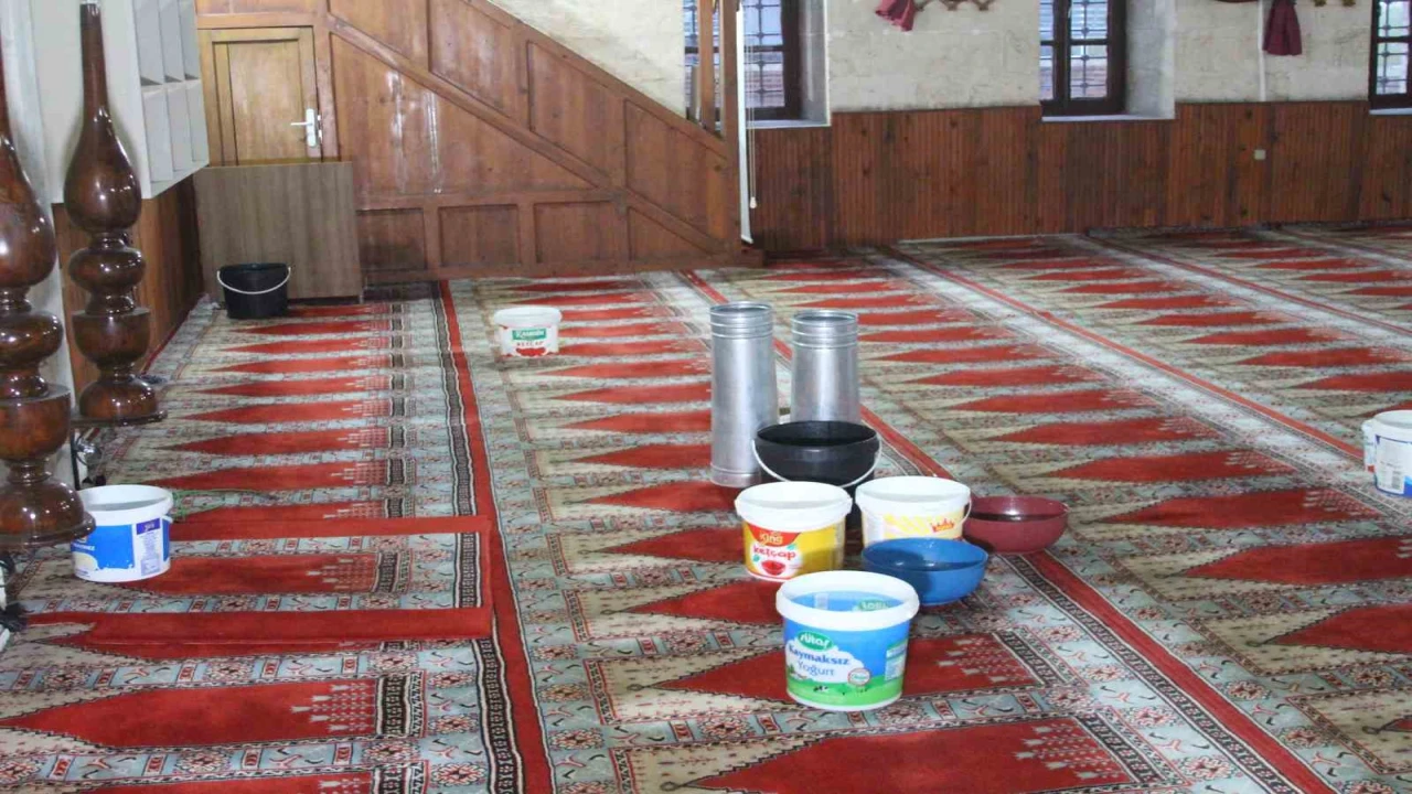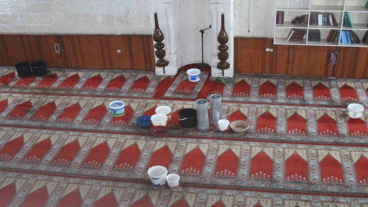 Adana’da 201 yıllık camide, sağanak yağışın ardından tavandan su akarken imam, akıntının olduğu noktalara kovalar yerleştirerek önlem almaya çalıştı.