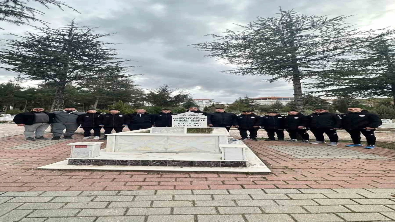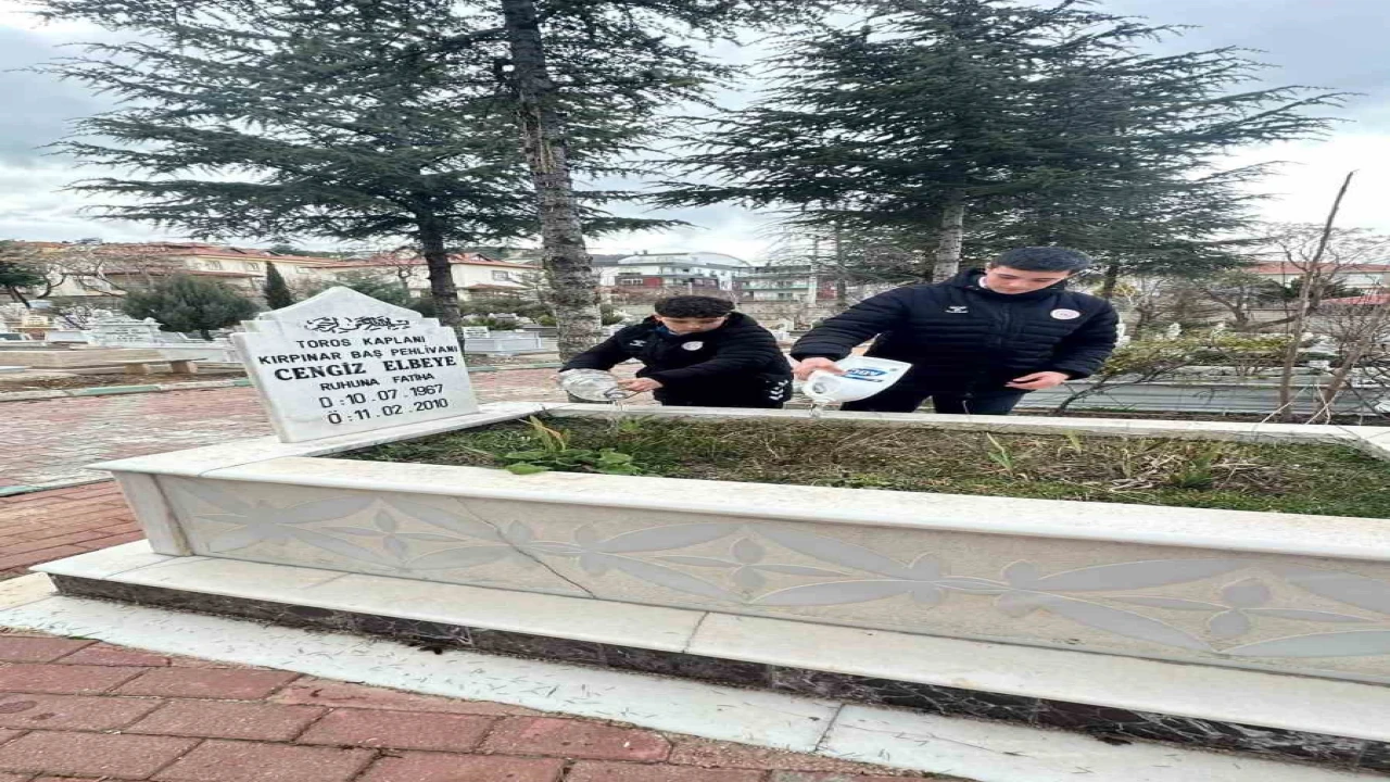 Korkuteli Cengiz Elbeye Güreş Eğitim Merkezi güreş antrenörleri Ali Topal, Ramazan Bözü ve Korkuteli Güreş Eğitim Merkezi ve Gençlik Hizmetleri İlçe Müdürü Ahmet Tunç, Cengiz Elbeye’nin mezarı başında dua etti.
