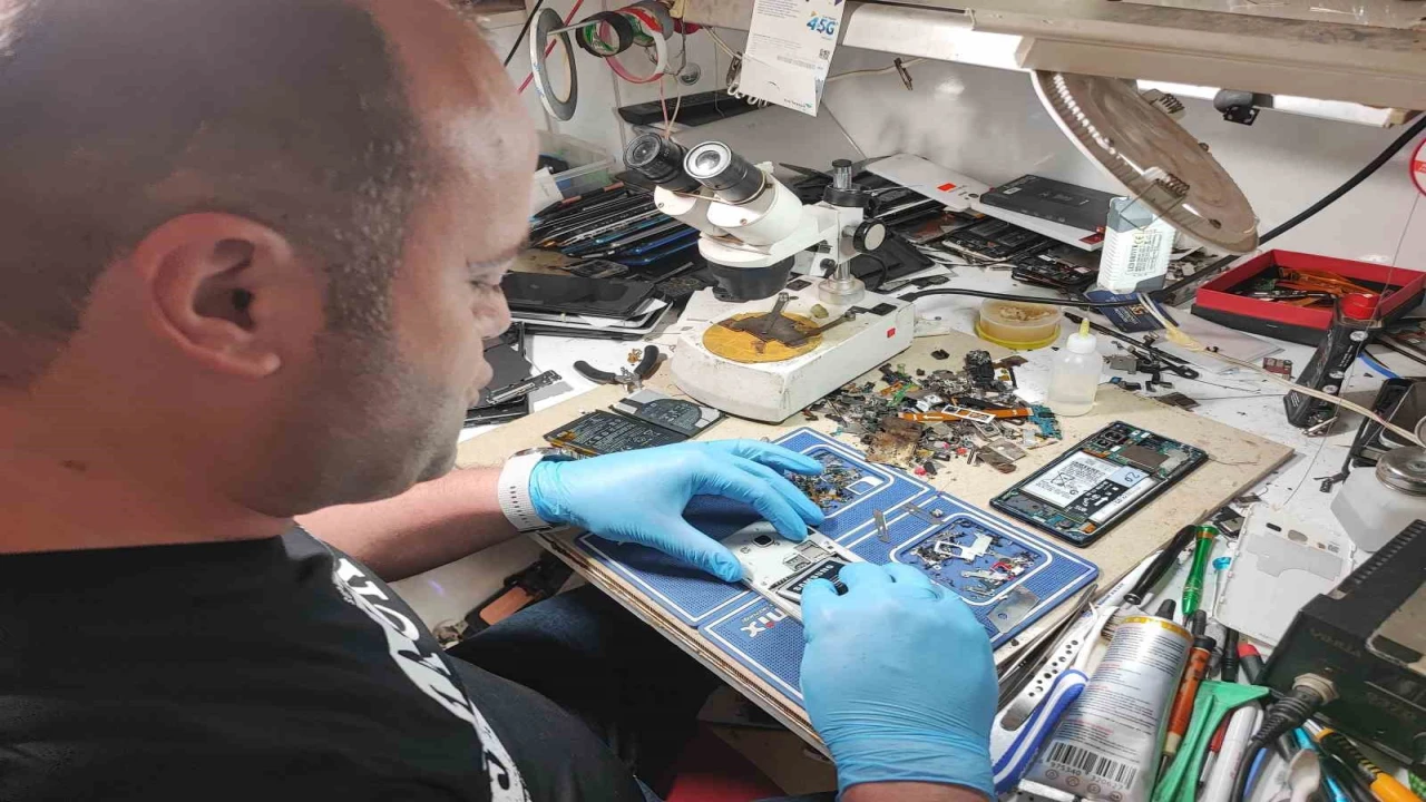Adana’da bir teknik serviste arızalı telefon kontrol edilirken bataryası patlayarak alev aldı, o anlar güvenlik kamerasına saniye saniye yansıdı.