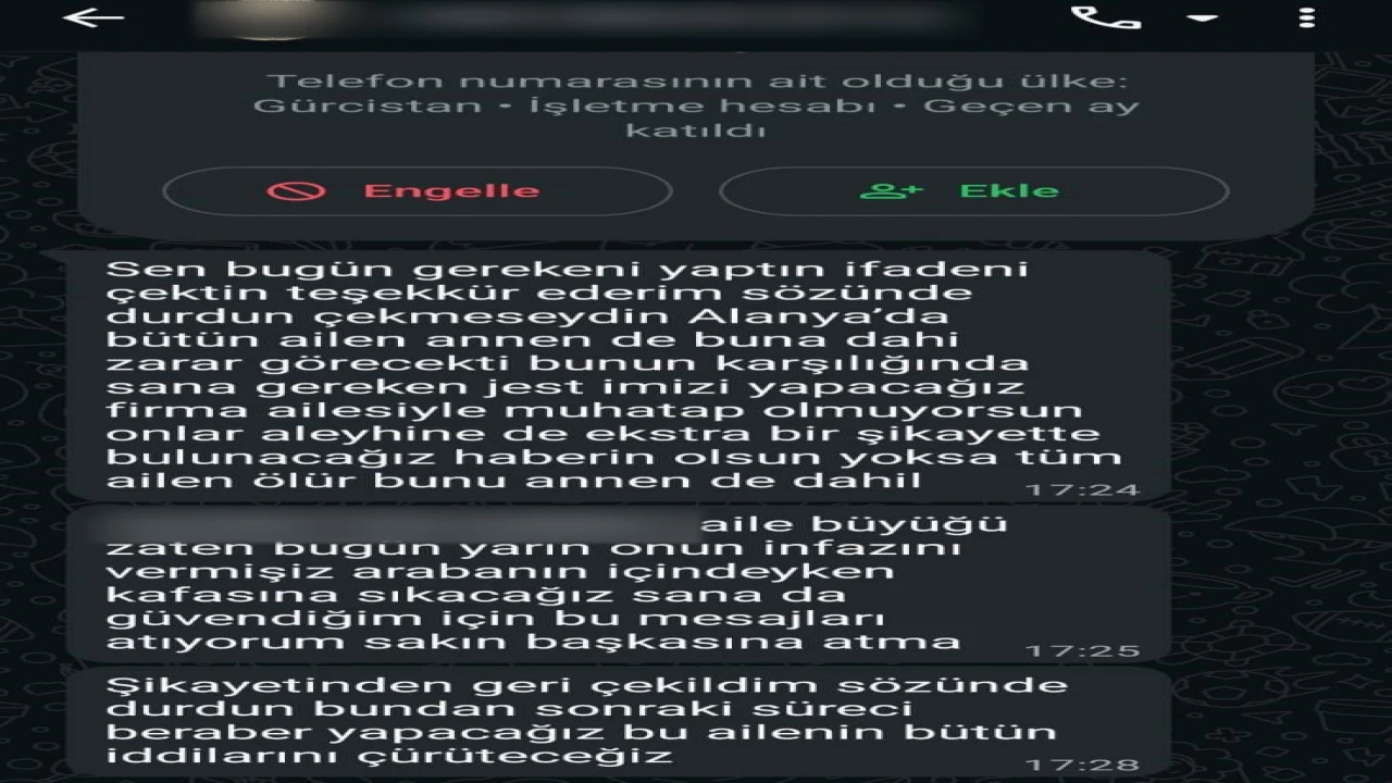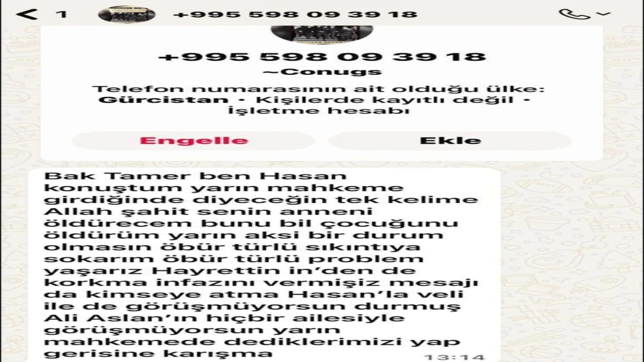 Ertürk, duruşma sonrası ise yine aynı numaradan, "Bugün gerekeni yaptın, ifadeni çektin teşekkür ederim. Çekmeseydin tüm ailen zarar görecekti. Bundan sonraki süreci beraber yapacağız, aksi halde tüm ailen ölür" şeklinde mesajlar geldiğini gösterdi.