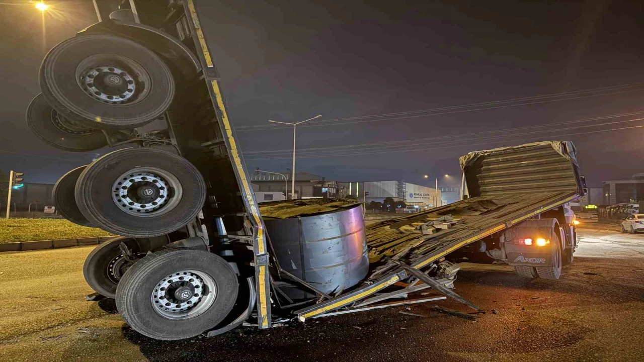 Hatay’da demir yüklü tırın dorsesi, seyir halindeyken ortadan ikiye ayrıldı. Dorseden düşen saçlar çevreye zarar vermezken, dorsenin arka kısmı şaha kalktı.