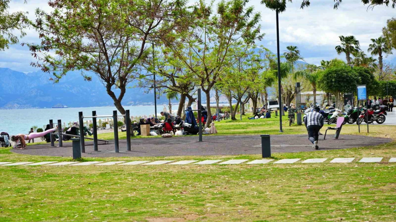 Antalya’da yalnızca deniz değil, sahil parkları ve yürüyüş alanları da doldu. Bebek arabalarıyla yürüyüş yapan ailelerden scooterla gezen gençlere, piknik yapanlardan bisiklete binenlere kadar herkes güneşin ve tatilin tadını çıkardı.