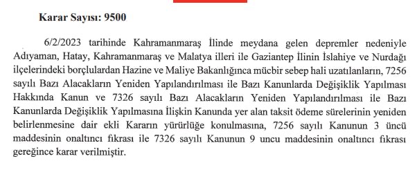 Bu kapsamda, Adıyaman, Hatay, Kahramanmaraş ve Malatya illeri ile Gaziantep'in İslahiye ve Nurdağı ilçelerinde ikamet eden borçlular için Hazine ve Maliye Bakanlığı tarafından mücbir sebep hali uzatılanların, 7256 sayılı Bazı Alacakların Yeniden Yapılandırılması ile Bazı Kanunlarda Değişiklik Yapılması Hakkında Kanun ve 7326 sayılı Bazı Alacakların Yeniden Yapılandırılması ile Bazı Kanunlarda Değişiklik Yapılmasına İlişkin Kanun kapsamında taksit ödeme süreleri yeniden belirlendi.