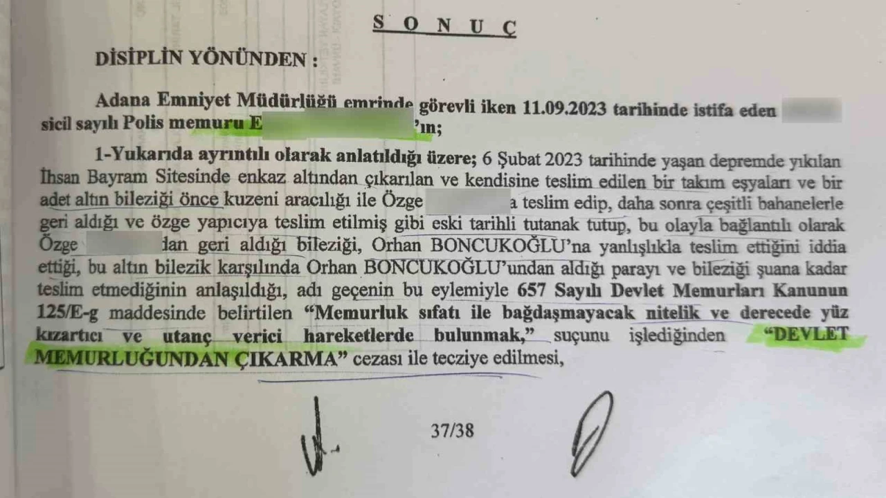 Adana’da depremde yıkılan binanın enkazından çıkan altınları, hayatını kaybedenlerin yakınlarına teslim ettikten sonra, "Savcılık geri istiyor, bütün altınlar toplandıktan sonra yeniden teslim edeceğiz" diyerek zimmetine geçirdiği tespit edilen polis memuru hakkında 2 kez ’devlet memurluğundan çıkartma’ cezası verildi. Soruşturması devam eden eski polisin, önümüzdeki günlerde ağır ceza mahkemesinde yargılanacağı öğrenildi.