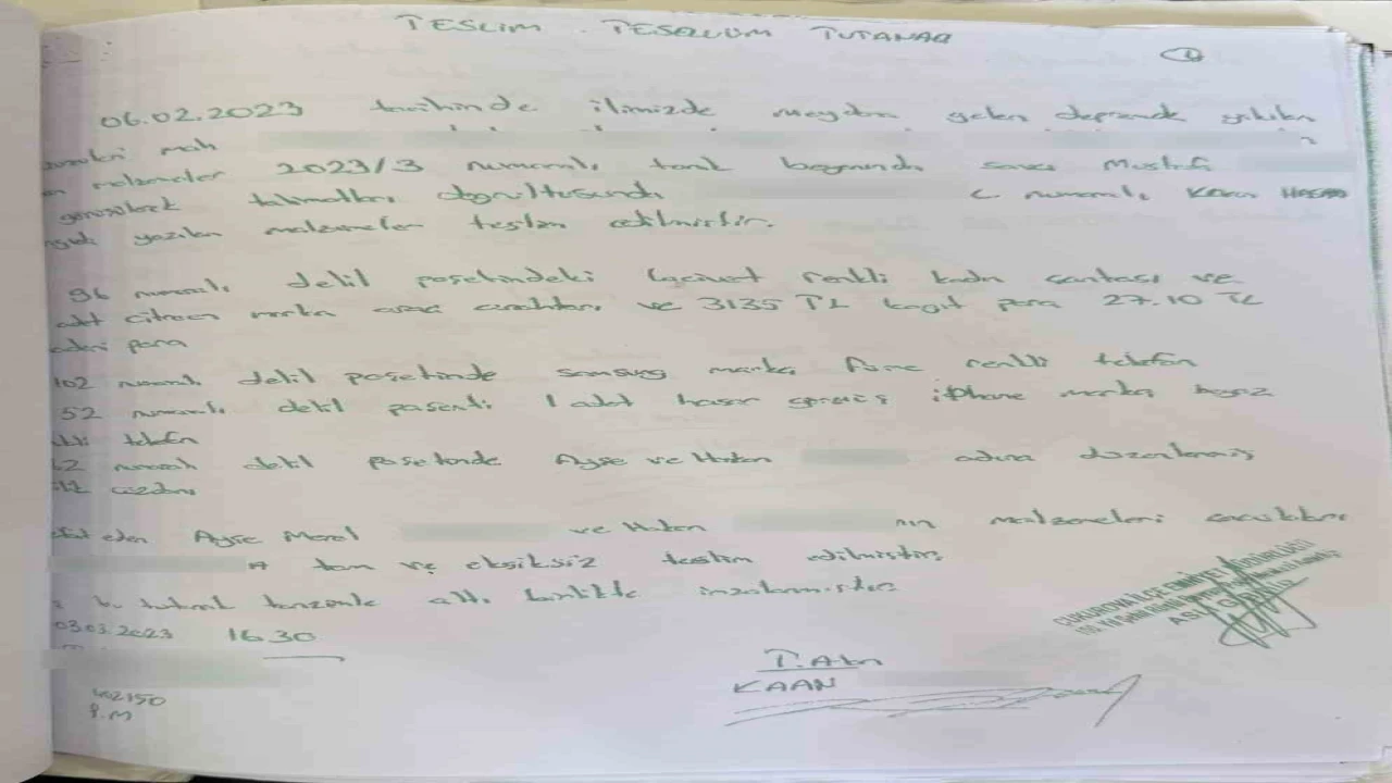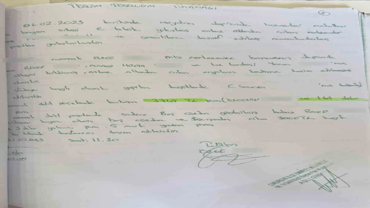 6 Şubat Kahramanmaraş merkezli depremlerde Adana’nın Çukurova ilçesi Huzurevleri Mahallesi’ndeki İhsan Bayram Sitesi C Blok’un yıkılması nedeniyle 82 kişi hayatını kaybetti, 6 kişi de yaralandı. Yıkılan binanın enkazından çıkartılan altınlar ise 100. Yıl Şehit Rüstü Bayram Polis Merkezi’ne teslim edildi. Burada görevli polis memuru E.C. (30), binada hayatını kaybedenlerin yakınlarına altınları polis merkezinde güvenlik kamerasının önünde tutanak düzenleyerek teslim etti.