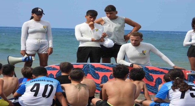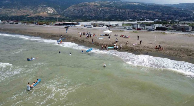 Hatay’ın Samandağ ilçesinde çocuklar, ücretsiz verilen kursta sörf yapmayı öğreniyor.